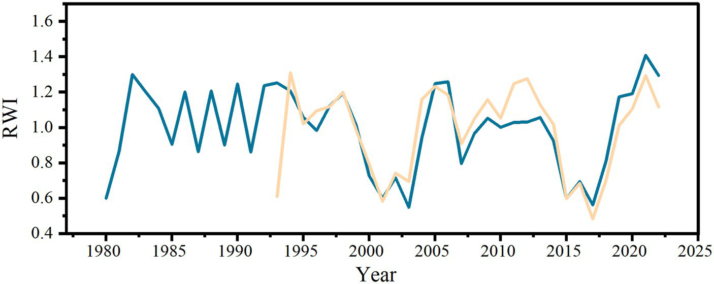 Change of ring-width index (RWI) of young and middle-aged stands The yellow line represents the RWI of young stands, and the blue line represents the RWI of middle-aged stands.
