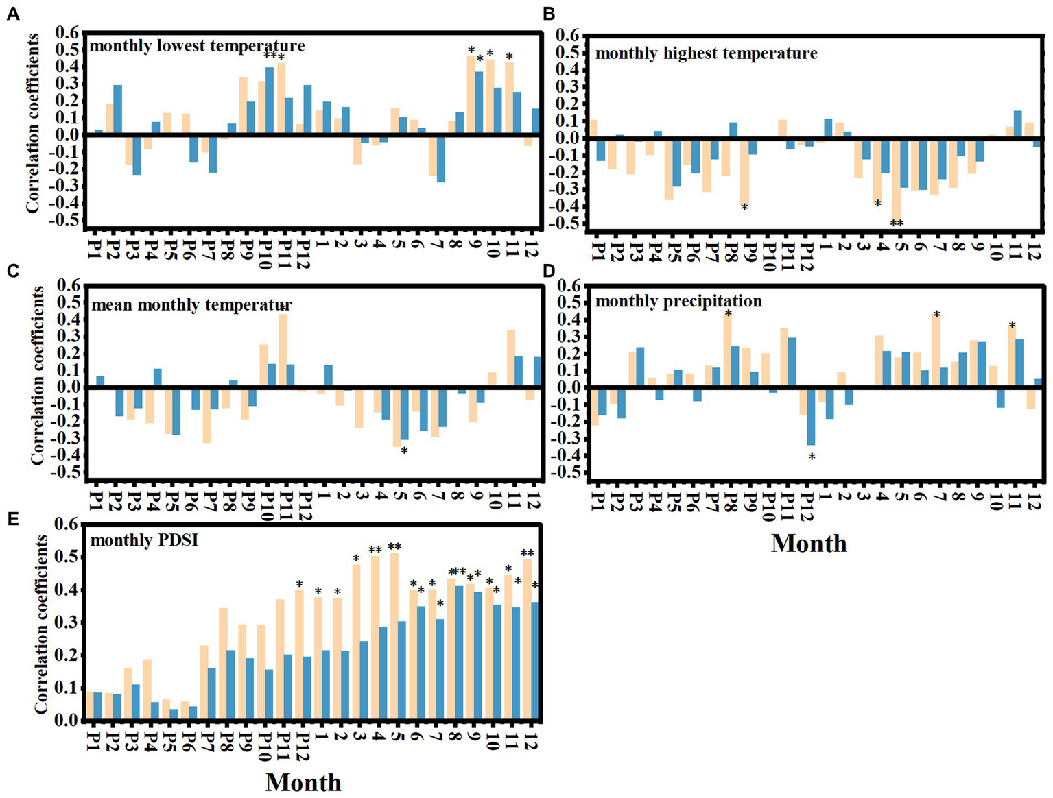 Correlation between different age stands and climatic factors. The correlation between different age stands and monthly lowest temperature (MLT) (A), monthly highest temperature(MHT) (B), monthly average temperature (MAT) (C), monthly precipitation (D), monthly average PDSI (E). The yellow and blue bar charts represent the correlation coefficients between the RWI of young and middle-aged stands and climatic factors, respectively. The letter P represents the month of the previous year, * indicates that there are significant differences between different age stands (p < 0.05), ** indicates that there are extremely significant differences between different age stands (p < 0.01).