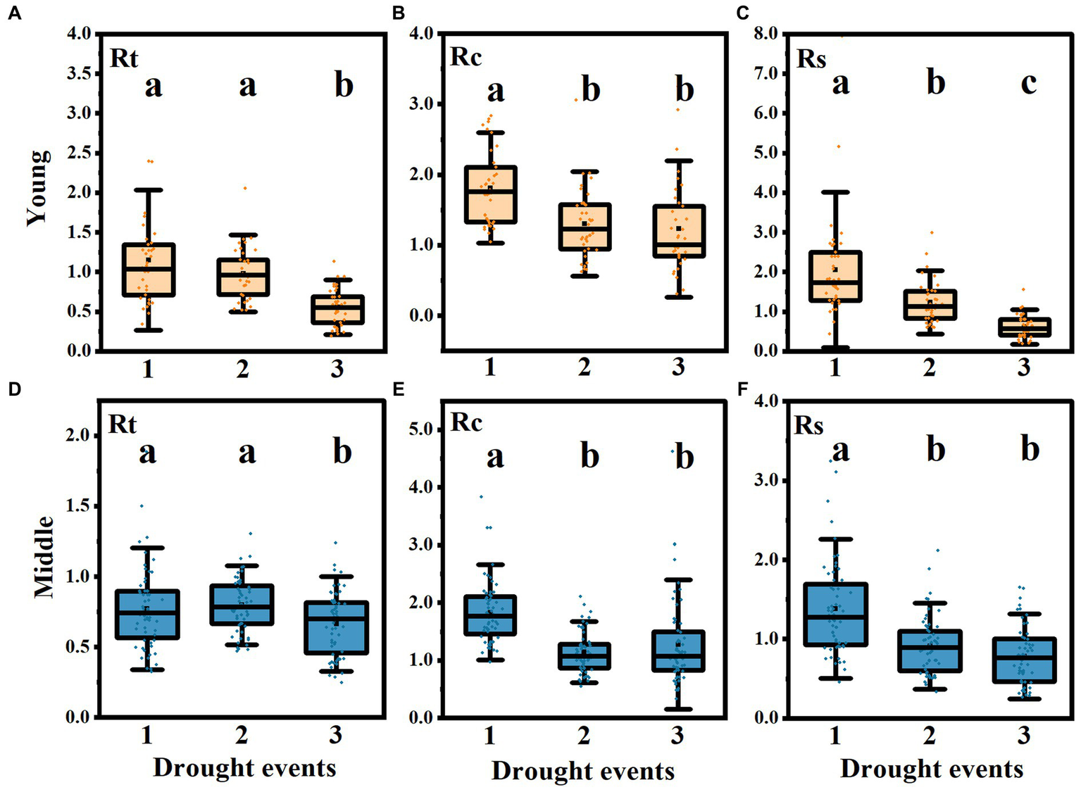 Difference analysis of Rt, Rc and Rs under different drought events. The changes of resistance (Rt) (A), recovery (Rc) (B), and resilience (Rs) (C) in young group and Rt (D), Rc (E), Rs (F) in middle-aged stands in three drought events. Black dots represent the median; the bottom and top of the box represent the first and third quartiles, respectively. The extension line represents the most extreme data points in the 1.5 times quartile range (the same below). Different letters indicated that there were significant differences between drought events (p < 0.05).