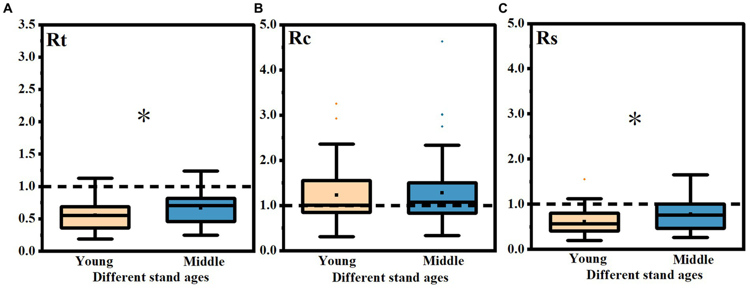 Difference analysis of Rt, Rc and Rs in different age stands after three drought events. The differences of Rt (A), Rc (B) and Rs (C) in different age stands after three drought events. * indicated that there were significant differences between different age stands (p < 0.05).