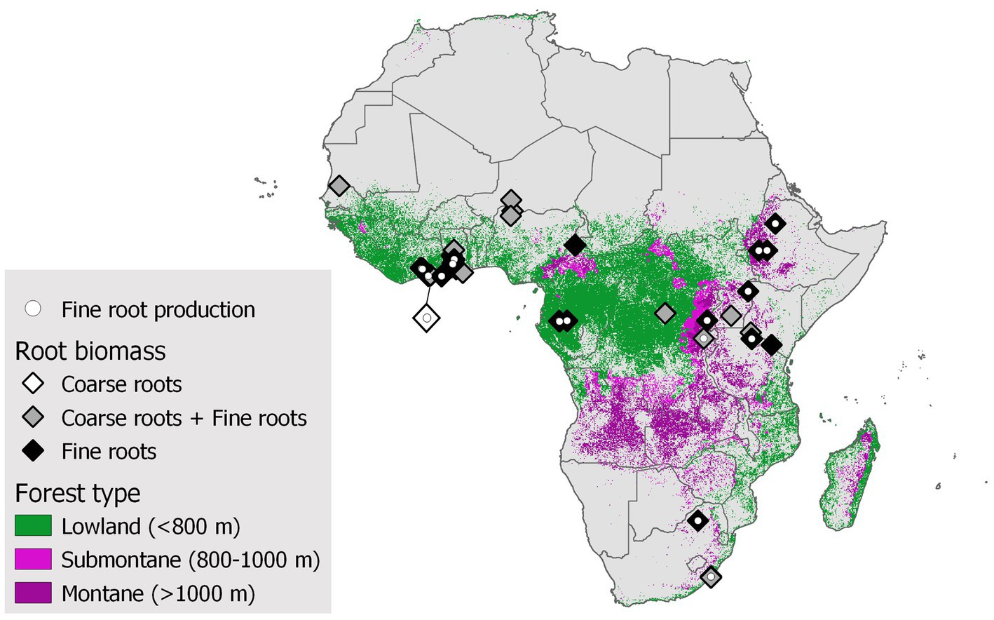 Map of the African continent showing the distribution of root biomass studies (white diamonds represent coarse roots, black diamonds represent fine roots, and gray diamonds represent fine and coarse roots) and fine root production (white circles inside diamonds) in forest ecosystems. The data are primarily extracted from the Fine-Root Ecology Database, version 3 (FRED3; Iversen et al., 2021) and complemented by a web of science search. The distinction of lowland forests and montane forests was made combining two geo-raster which contained information on vegetation types (ESA, 2017) and elevation (NOAA National Geophysical Data Center, 2022), respectively. We followed the parameters of 0–800 m for lowland forests, 800–1,000 m for submontane forests as described in Cuni-Sanchez et al. (2021) and define forests at >1,000 m as montane forests.