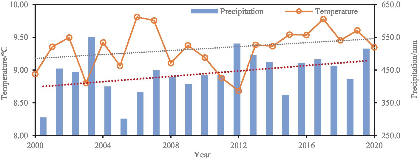 Interannual variations of temperature and precipitation in Yulin from 2000 to 2020 are shown in Figure 9. As seen, the temperature in the region of Yulin varied from 8.68 to 9.81°C from 2000 to 2020, and the average temperature was 9.33°C. The precipitation in the region of Yulin varied from 301.8 to 550.1 mm from 2000 to 2020, and the average value was 438.91 mm. Both the temperature and precipitation showed a very slow increasing trend. As can be seen, the climate presented a certain degree of humid trend in Yulin from 2000 to 2020, while the temperature showed a fluctuation change with no obvious increase.