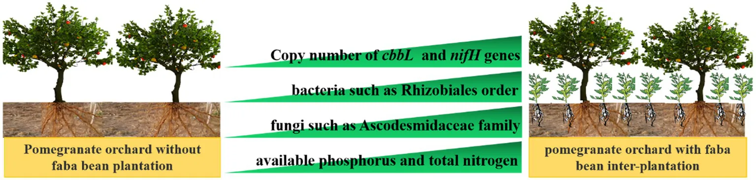 Interplanting legumes and other cash crops in a pomegranate orchard can effectively increase economic benefit, improve the soil quality of the pomegranate orchard, and alleviate the restrictions that arise from continuous cropping. Long-term cultivation of single crops can reduce soil microbial diversity and the numbers of beneficial microorganisms, resulting in an imbalance of soil microbial structure and the aggravation of soil-borne diseases (Kelderer et al., 2012; Urashima et al., 2012; Yang et al., 2012; Zhao et al., 2016). An increase of plant diversity can promote the increase of soil microbial diversity and decrease the abundance of soil pathogenic microorganisms (Qiao et al., 2012). In an intercropping system, crop root interaction can cause changes in soil microorganisms, and plant root exudates can attract more beneficial microorganisms to participate in nutrient cycling and inhibit the spread of soil-borne pathogens. In this study, the bacterial abundance decreased with the decrease of Proteobacteria abundance in the rhizosphere soil of a pomegranate orchard. Interplanting with faba bean increased the Shannon and Chao1 indices of both soil bacteria and fungi, significantly changed the soil microbial community structure, significantly enriched N-fixing and C-converting microorganisms, and significantly increased the copy numbers of cbbL and nifH genes in soil. These changes can alter the soil microbial community structure and improve soil C and N nutrition in orchards, and these results provide new ideas for the prevention and control of soil microbial structure imbalance and soil-borne diseases caused by long-term single continuous planting in orchards.