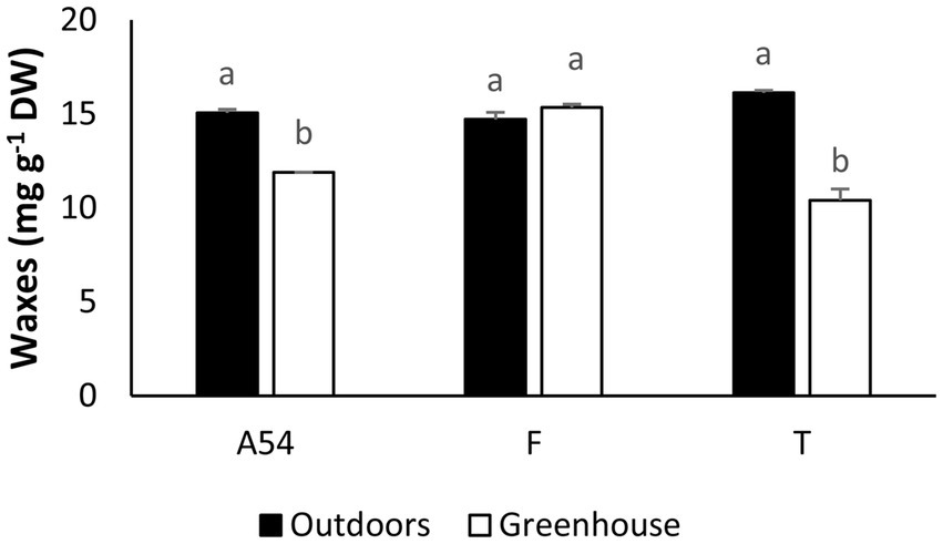 Soluble cuticular lipid (wax) concentrations (mg g−1 D.W.) of P. canariensis needles collected from seedlings grown outdoors or in a greenhouse during winter. Different letters indicate significant differences between means according to Tukey’s HSD test. Mean values ± SE (n = 2).
