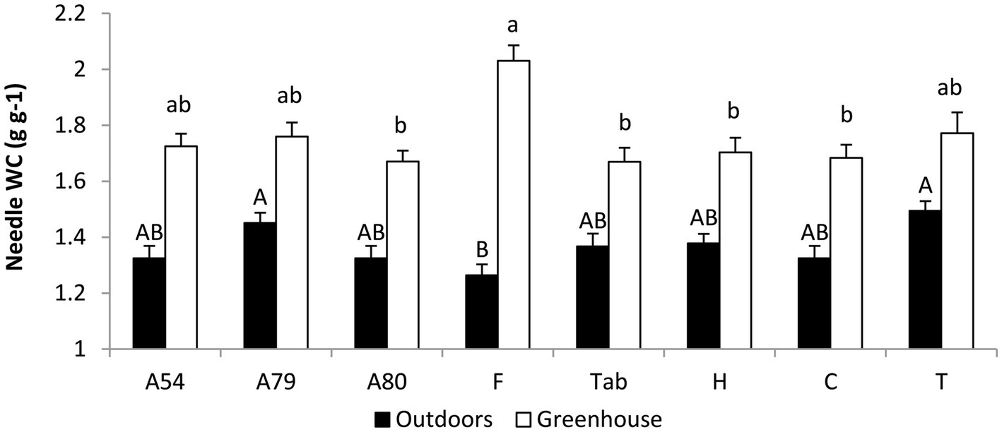 Average ± SE values of needle water content calculated on a dry weight basis (NWC). Values were measured in two-year old P. canariensis seedlings from different populations growing outdoors (freezing temperatures) or inside a greenhouse (chilling temperatures) during winter. Different letters indicate significant differences between means for plants growing outdoors (upper-case) or inside the greenhouse (lower-case) according to the unequal N HSD test (n = 3–6 plants per population or family and growing location).