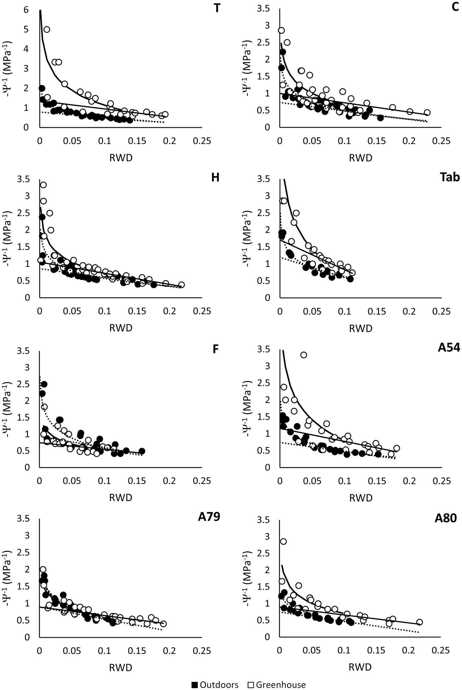 Pressure-volume curves obtained for several populations of P. canariensis using the free-transpiration method. Data were collected from basal shoots cut from 2-year-old seedlings growing outdoors (solid symbols) or inside a greenhouse (empty symbols) in winter. Dashed lines show the logarithmic and linear regressions fitted to data obtained before and after reaching the turgor loss point in plants growing outdoors. Solid lines show the logarithmic and linear regressions for plants growing inside the greenhouse. Note the different scale in the Y-axis for the population Teide (T), n = 3–4 plants per population or family and growing location.