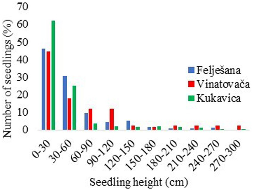 The analysis of the regeneration process focused on beech seedlings, given the negligible presence of other species (sycamore maple, wild cherry, sessile oak, hornbeam, etc.), which made their separate analyses unfeasible (Table 3). The regeneration process within these stands was characterized by high stability, as evident from the large number of seedlings. The Felješana old-growth forest had the highest number of seedlings, while the Vinatovača and Kukavica old-growth forests had 33.6 and 51.0% fewer seedlings, respectively (Table 3). These findings can be logically explained by the observation that a significant number of standing and fallen dead trees were recorded in the Felješana old-growth forest. These trees spontaneously created conditions favorable for the formation of seedling banks. All three studied stands had a large number of one-year-old seedlings, indicating the significant regenerative potential of parent trees in these stands and the limited conditions for the development of older seedlings. Older seedlings were mostly found in stand openings, where they had enough resources for their development. It was in these openings that beech seedling banks were formed, whereby the seedling height varied with the time of opening formation or the seedling bank formation.