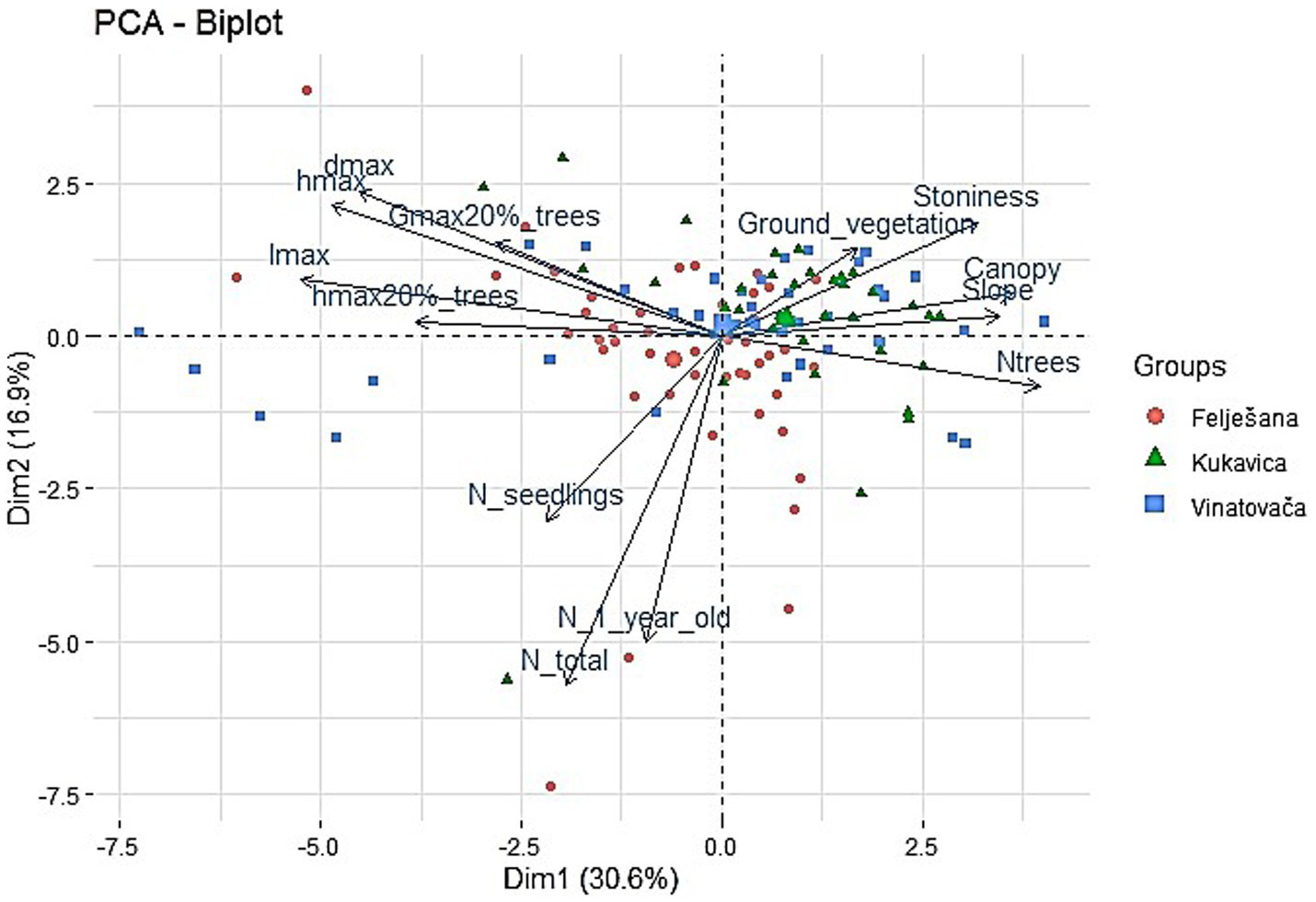 Principal component analysis (PCA) was used to analyze relationships between stand parameters (number of trees on a circular sample plot (N_trees), basal area of the 20% of largest trees (Gmax20%_trees), total height of the 20% largest trees (hmax20%_trees) and canopy), regeneration layer (the number of one-year-old seedlings (N_1_year_old), number of older seedlings (N_seedlings), total number of seedlings (N_total), maximum diameter at root collar of seedlings (dmax), maximum height of seedlings (hmax), maximum height increment of seedlings (lmax) and the presence of ground vegetation (Ground_vegetation)) and research plot attributes (Slope, Stoniness). The results of the PCA were visually presented in the form of an ordination diagram. PCA analysis was performed using MASS (Venables and Ripley, 2002), factoextra (Kassambara and Mundt, 2020), and ggplot2 (Wickham, 2016) packages.