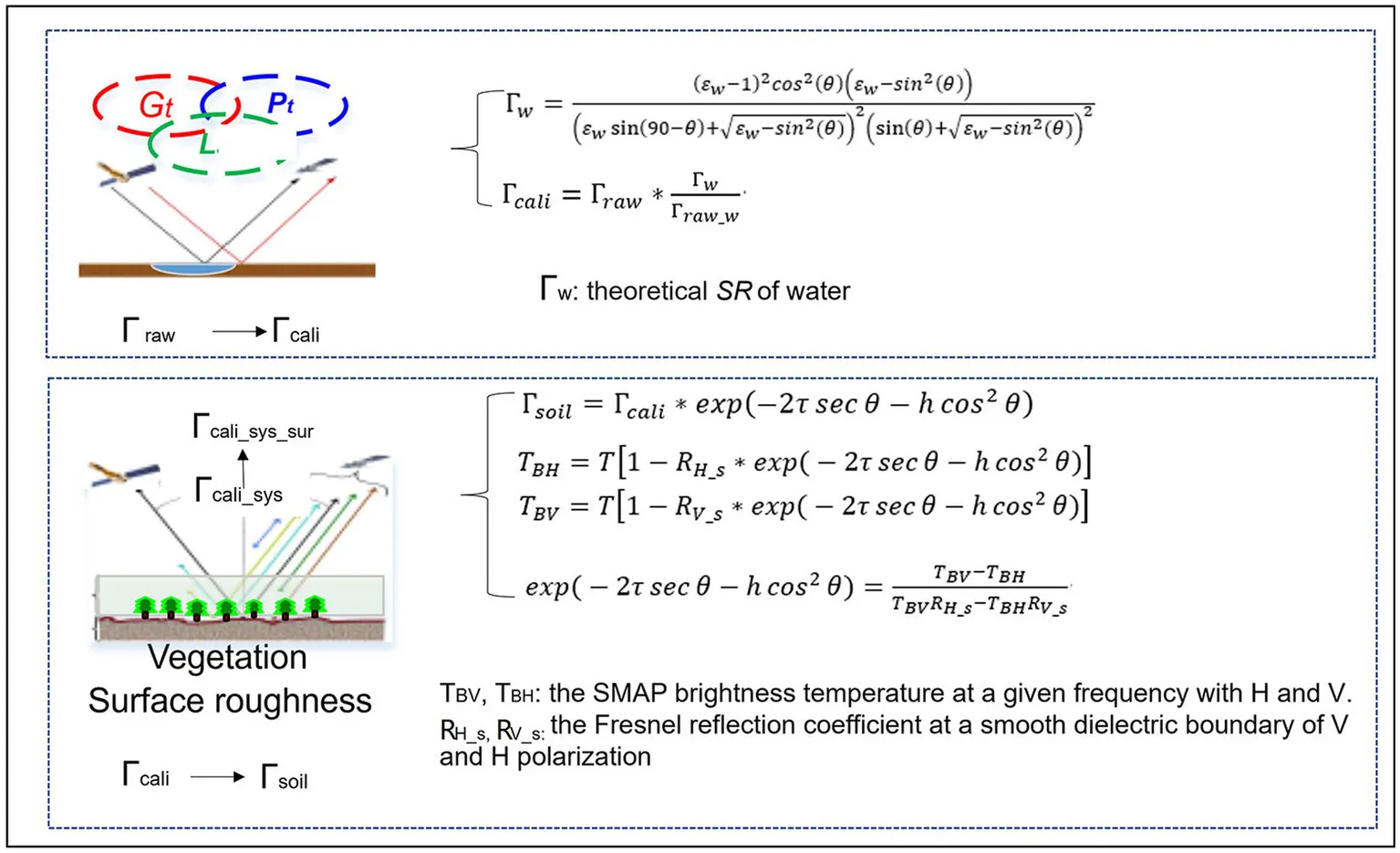 For the second calibration step, we have made initial attempts to calibrate the attenuation due to vegetation and surface roughness on the CYGNSS SR by proposing a physics-based algorithm using SMAP brightness temperature (TBp) (Yang et al., 2022a,b).