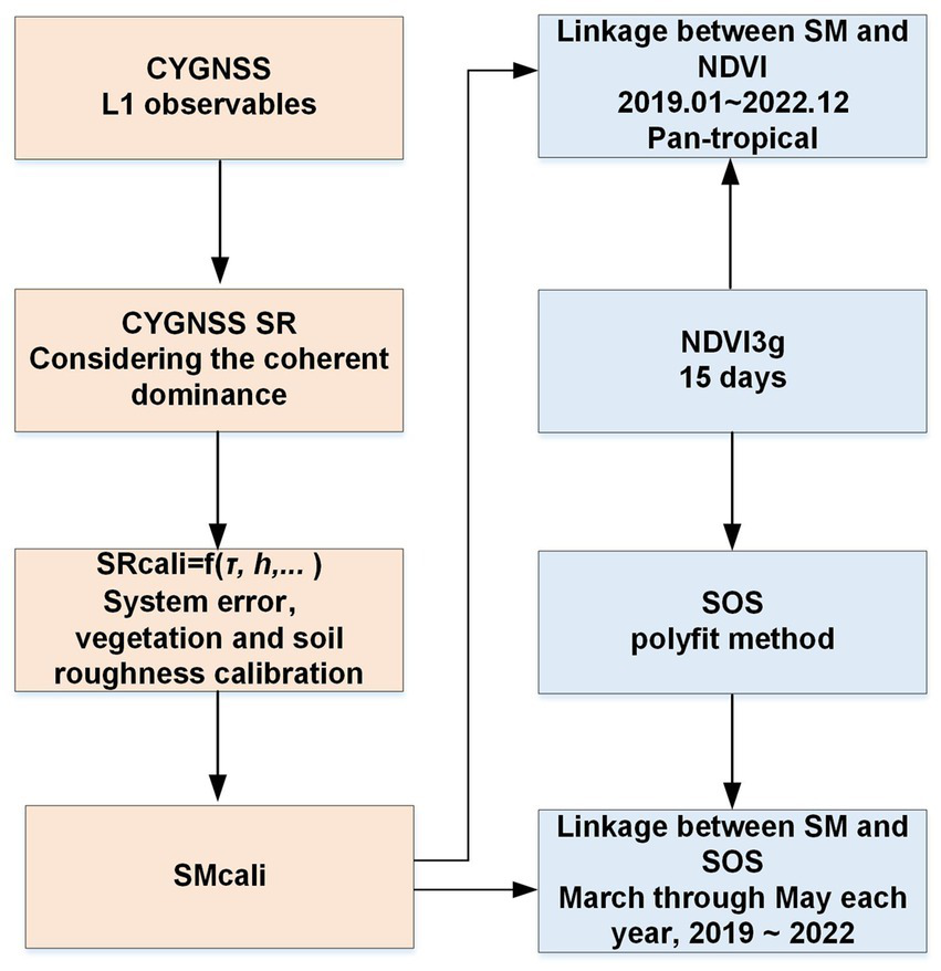 Figure 1 shows the flowchart of this study. The main steps are summarized as follows: (1) The CYGNSS SM from January 2019 to December 2022 with land surface and system errors calibration is first retrieved; (2) The CYGNSS SM is matched to NDVI with the temporal resolution of 15 days, aiming to investigate the impact of SM on vegetation; (3) the resulting SOS from NDVI is matched up with CYGNSS SM, to analyze the spring phenology response to SM.