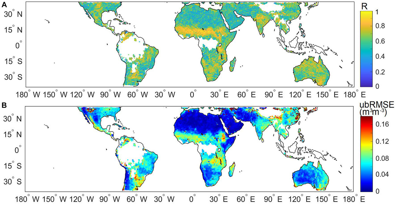 The statistical indices, i.e., R and ubRMSE at each grid in 2022, are shown in Figure 2. Generally, the R-values between CYGNSS SM and SMAP SM show a good spatial distribution globally (i.e., R = 0.693). Over 60% of the CYGNSS SM of the grid cells in the domain closely matches the SMAP SM (r > 0.5); approximately 12% of cells have moderate to strong positive correlation (r > 0.7), while approximately 13% of cells show a weak correlation (r < 0.4). The lower R values in these areas may reflect one or more contributing factors, including the effects of incoherent signals and associated SMAP SM uncertainty. In terms of the ubRMSE results, as illustrated in Figure 2B, the value of ubRMSE is smaller at 0.07 m3m−3 in most regions. Specifically, the values of ubRMSE are smaller in regions with lower SM values, such as the Sahara Desert, usually less than 0.02 m3m−3, with correspondingly higher R-values. On the contrary, in regions with high SM values, such as India, the ubRMSE values become larger, and the R-values are lower.