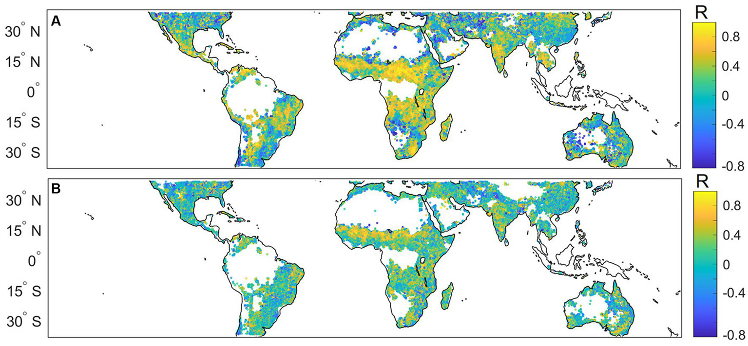 Previous studies have shown a strong sensitivity between SM and vegetation, and the sensitivity varies with vegetation type and climate. Luo et al. (2021) demonstrated that in the Mongolian Plateau, vegetation phenology showed a strong seasonal variation in response to SM. Zhao et al. (2023) utilized the long-term normalized difference vegetation index (NDVI) and the Global Land Evaporation Amsterdam Version 3a (GLEAM v3a) SM, to investigate the variation of vegetation dependence on SM in China. However, the SM used in the above studies was derived from reanalysis data or land surface models, which may have some limitations in terms of accuracy (Dong et al., 2020). In addition, the link between SM and vegetation activity needs to be further quantified in the pan-tropical region, especially in water-scarce areas.