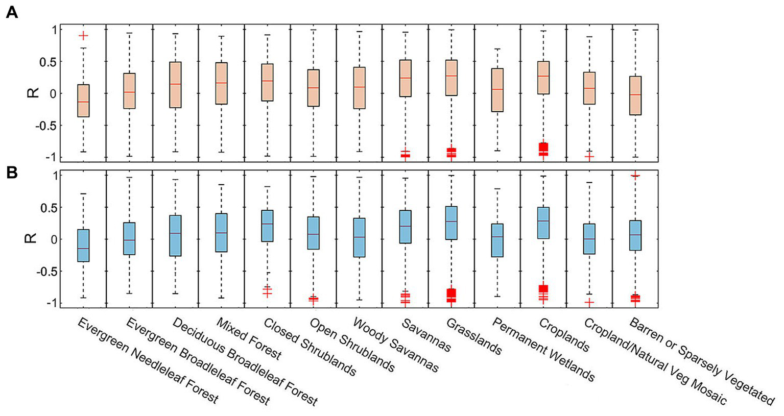 Boxplots of R for 13 land types in the period from August from 2019.01 to 2022.12. (A) CYGNSS SM vs. NDVI, (B) SMAP SM vs. NDVI.