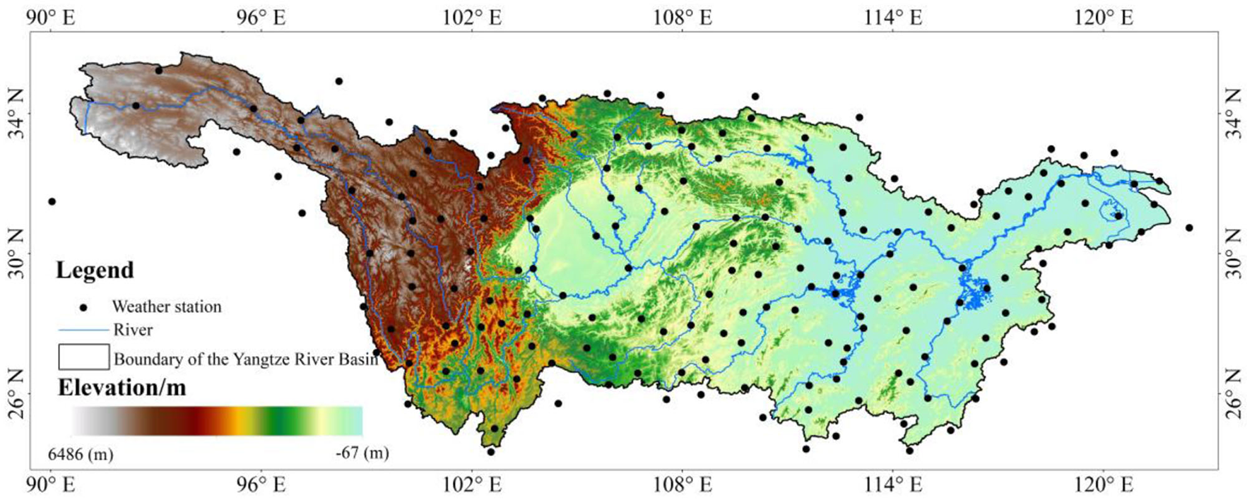 The Yangtze River originates from the Tanggula Mountains on the Qinghai Tibet Plateau and spans three major regions of western, central, and eastern China. The river passes through 11 provinces and cities before reaching the East China Sea. The watershed area of the Yangtze River is ~1.8 million km2, with elevation changes ranging from −67 to 6,486 m. Geographically, it is located between 24 ° N-34 °N and 90 ° E-122 ° E (Figure 1). The basin is characterized by abundant precipitation and a warm climate. It has a subtropical monsoon climate, with a mean annual precipitation of ~1,122 mm. The distribution of precipitation is uneven throughout the year, with 60% concentrated in the summer. This region is of great importance for population and industrial concentration in China, contributing significantly to the country's GDP. However, it also faces challenges due to its relatively fragile ecological environment (Yang et al., 2021).