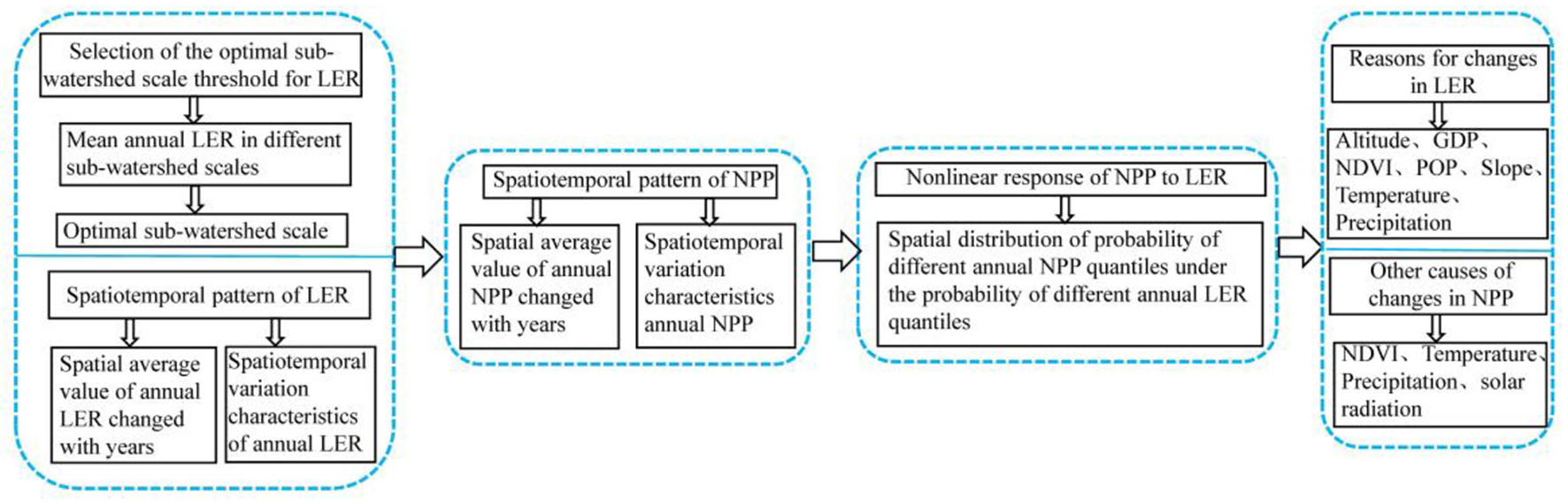 Hence, the primary objectives of this study are (1) examining the spatiotemporal patterns of LER in the Yangtze River Basin over an extended period, (2) quantifying the non-linear relationship between NPP and LER using conditional probability, and (3) investigating the key drivers of LER alteration and additional factors impacting NPP alterations.