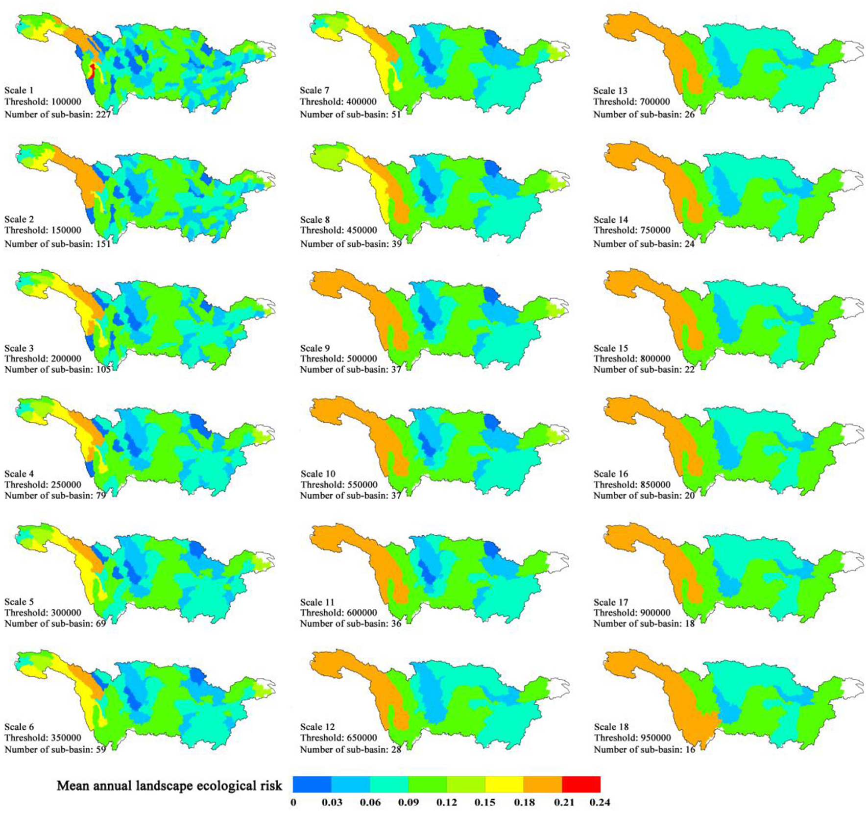 Spatial distribution of mean annual landscape ecological risk in different sub-watershed scales.
