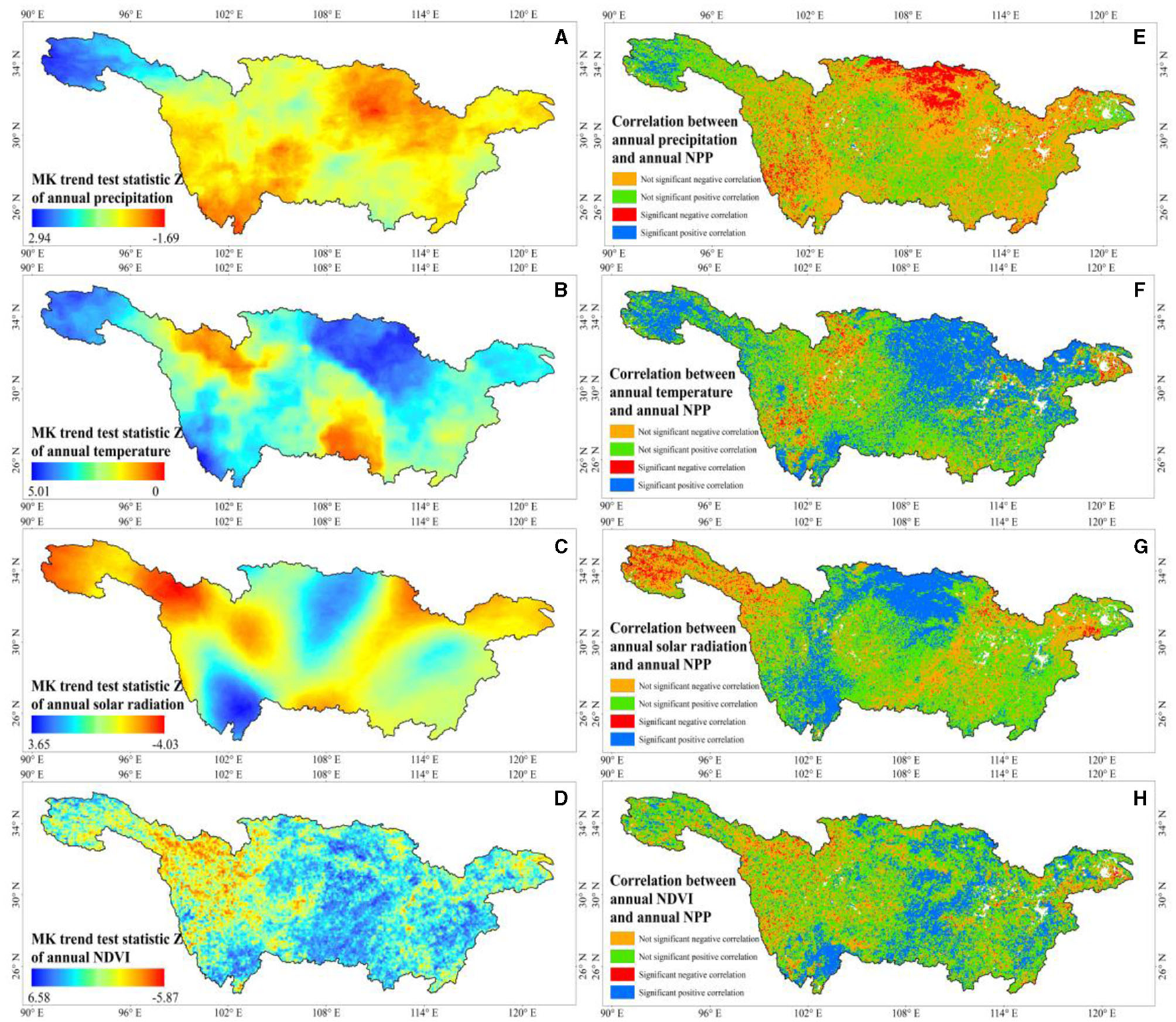 Trend of annual precipitation (A), annual temperature (B), annual solar radiation (C), annual NDVI (D), and their correlation with NPP (E–H), respectively.