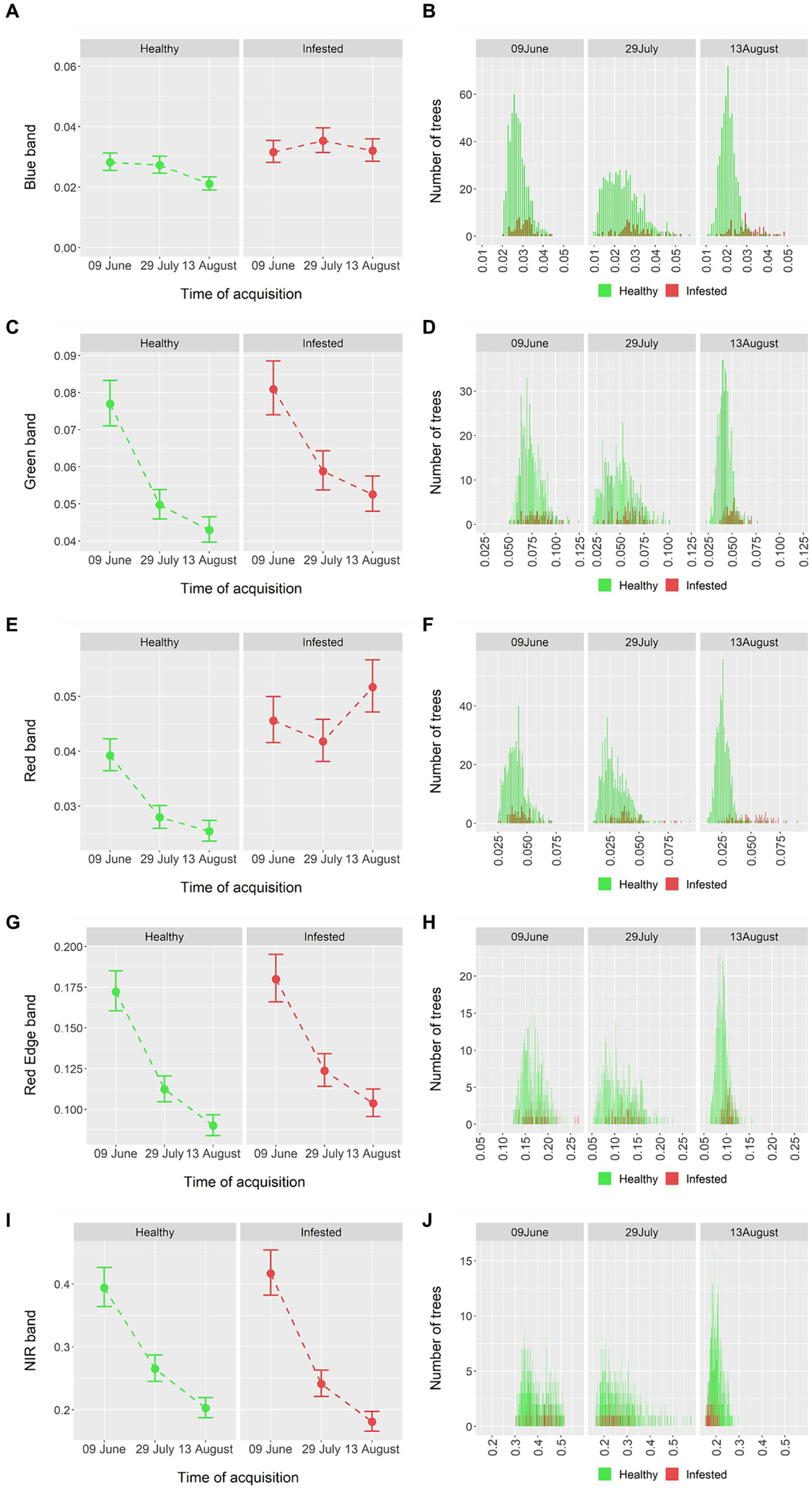 (A,C,E,G,I) Surface reflectance (Y-axis) of individual spectral bands (X-axis) at different time points showing healthy (green) and newly infested (red) trees. The color dots are fitted values resulting from the mixed-effect model, whiskers represent 95% confidence interval. (B,D,F,H,J) Histograms presenting the frequencies of surface reflectances of healthy (green) and infested (red) trees (B,D,F,H,J).