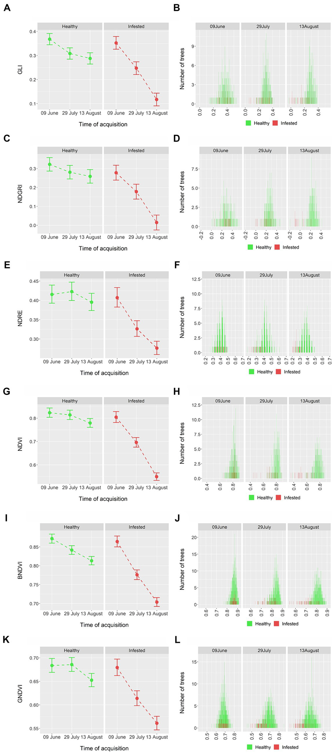 (A,C,E,G,I,K) Vegetation indices values (Y-axis) at different stages of the bark beetle infestation (X-axis), indicating healthy (green) and newly infested (red) trees. The color dots are fitted values resulting from the mixed-effect model, whiskers represent 95% confidence intervals; (B,D,F,H,J,L): histograms showing frequencies of individual values.