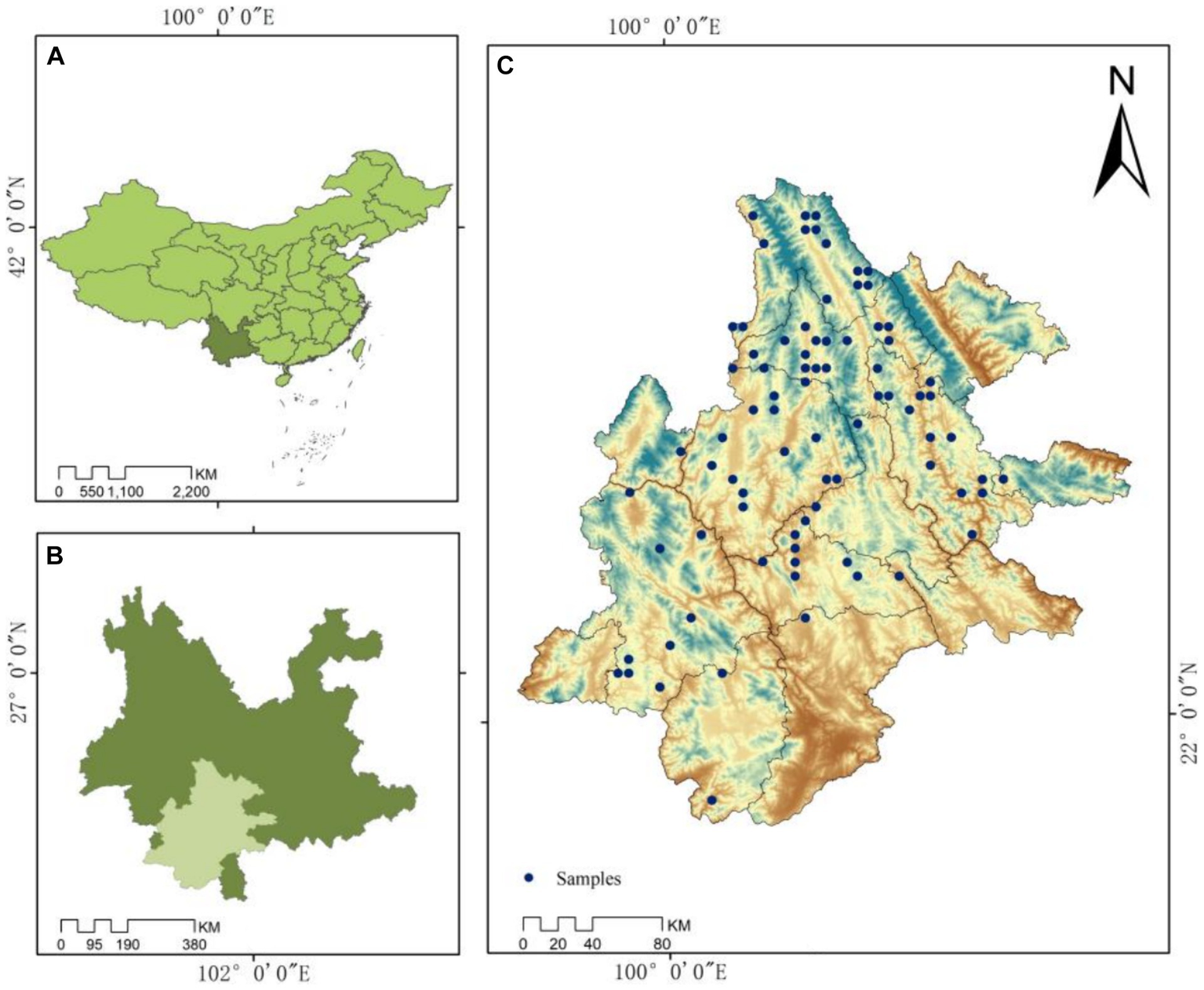 The study sites (Figure 1) are situated in the southern region of the Yunnan province, encompassing a blend of subtropical and tropical zones, exhibiting an average annual temperature spanning from 17°C to 22°C. Annual precipitation exceeds 1,500 mm, while relative humidity surpasses 80%. The study area comprises expansive valleys, as well as low mountains and hills, with altitudes ranging from 600 m to 1700 m. P. kesiya var. langbianensis, a distinctive tree species in Yunnan, is predominantly distributed across Malipo County, Puer City, Mangshi City of Dehongtai, and the Jingpo Autonomous Prefecture in western Yunnan. These regions collectively encompass 11% of Yunnan’s forest-covered expanse. This evergreen tree species belongs to the Pinus kesiya family and thrives as a light-demanding plant, favoring elevated temperatures and humid environments. Conversely, it exhibits intolerance toward cold, arid conditions, and infertile soil. Recognized as a fast-growing coniferous species, P. kesiya var. langbianensis holds significant economic value alongside its ecological roles and services, including carbon sequestration.