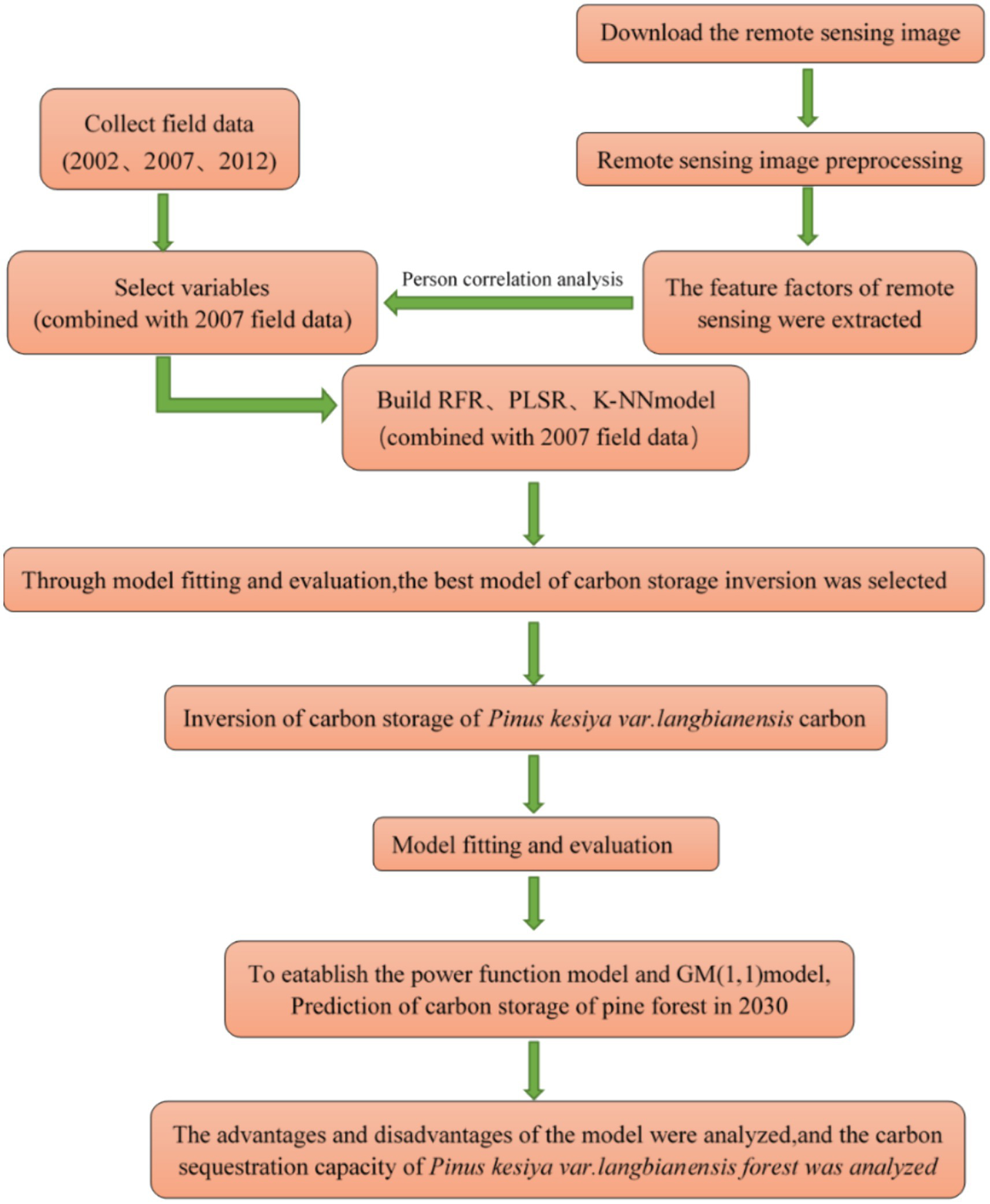 In this study, carbon storage was estimated using three algorithms: the K-nearest neighbor (K-NN) method, the random forest regression model, and the partial least squares regression. Utilizing data from 81 permanent plots in the Yunnan Forest survey of 2007 and Landsat satellite remote sensing images obtained from the Google Earth Engine remote sensing cloud platform, regression modeling and evaluation occurred over three feature selection stages. The optimal remote sensing model for estimating carbon storage in the P. kesiya var. langbianensis forest was chosen. Model performance was assessed through determination coefficient (R2) and root mean square error (RMSE), while predictive capability was measured by prediction accuracy (P). Employing the selected model alongside remote sensing feature variables for relevant years (2000, 2002, 2010, and 2020), carbon storage for P. kesiya var. langbianensis forest in those corresponding years was inferred. Using the GM (1,1) model, carbon storage for P. kesiya var. langbianensis forest in 2002 and field data from 2007 and 2012 were fitted, with subsequent prediction and comparison of carbon storage for P. kesiya var. langbianensis forest in 2017 against measured 2017 data. This process demonstrated the viability of the GM (1,1) model. Upon demonstrating the feasibility of the GM (1,1) model, the carbon storage model for the P. kesiya var. langbianensis forest in 2000, 2010 and 2020 was established, along with the prediction of its carbon storage up to 2030. To compare the predictive capabilities of the GM (1,1) model, the power function model was used as its counterpart. The technical process is shown in Figure 2.