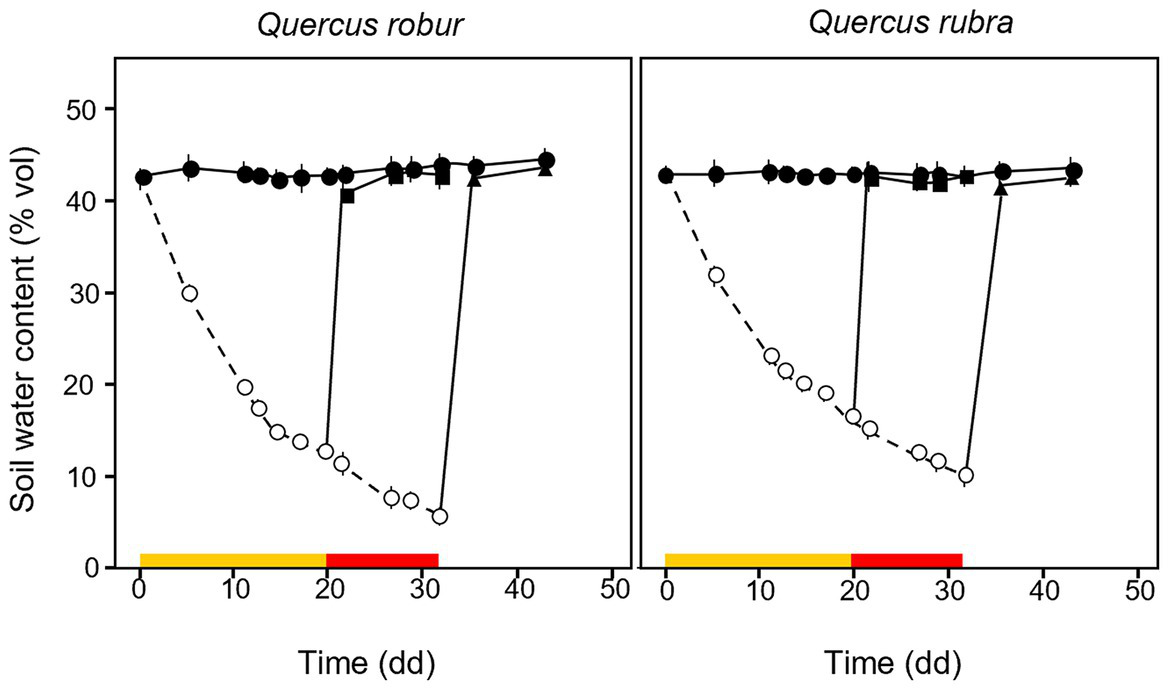 Temporal pattern of soil volumetric water content (SWC) over the experimental period for 4 months-old Quercus robur (left column) and Quercus rubra (right column) seedlings under two drought intensity levels with the respective rewatering events. Continuous (–) and dashed (– – –) lines indicate watered and drought conditions, respectively; filled and white circles indicate control and droughted plants, respectively; filled square and triangle indicate the release from drought 12 days from MD and SD stress, respectively. Values are the means of 6 replicates ±1SE. Colored strips indicate the duration and intensity of the drought treatments: dark-yellow for moderate-drought, red for severe-drought.