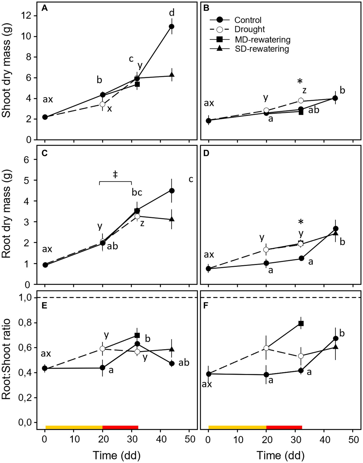 Temporal pattern of shoot (A,B) and root (C,D) dry mass and root-to-shoot ratio (E,F) over the experimental period for 4 months-old Quercus robur (left column) and Quercus rubra (right column) seedlings under two drought intensity levels with the respective rewatering events. Continuous (–) and dashed (– – –) lines indicate watered and drought conditions, respectively; filled and white circles indicate control and droughted plants, respectively; filled square and triangle indicate the recovery from drought 12 days from MD and SD stress, respectively. Values are the means of 6 replicates ±1SE. Colored strips indicate the duration and intensity of the drought treatments: dark-yellow for moderate-drought, red for severe-drought. If written, a, b, c and x, y, z indicate significant differences between different sampling points within control and drought treatments, respectively (LSD, p < 0.05); * indicate significant differences between control and drought within each sampling point, and ‡ between droughted and rewatered plants for both MD and SD treatments (student’s t-test, p < 0.05).