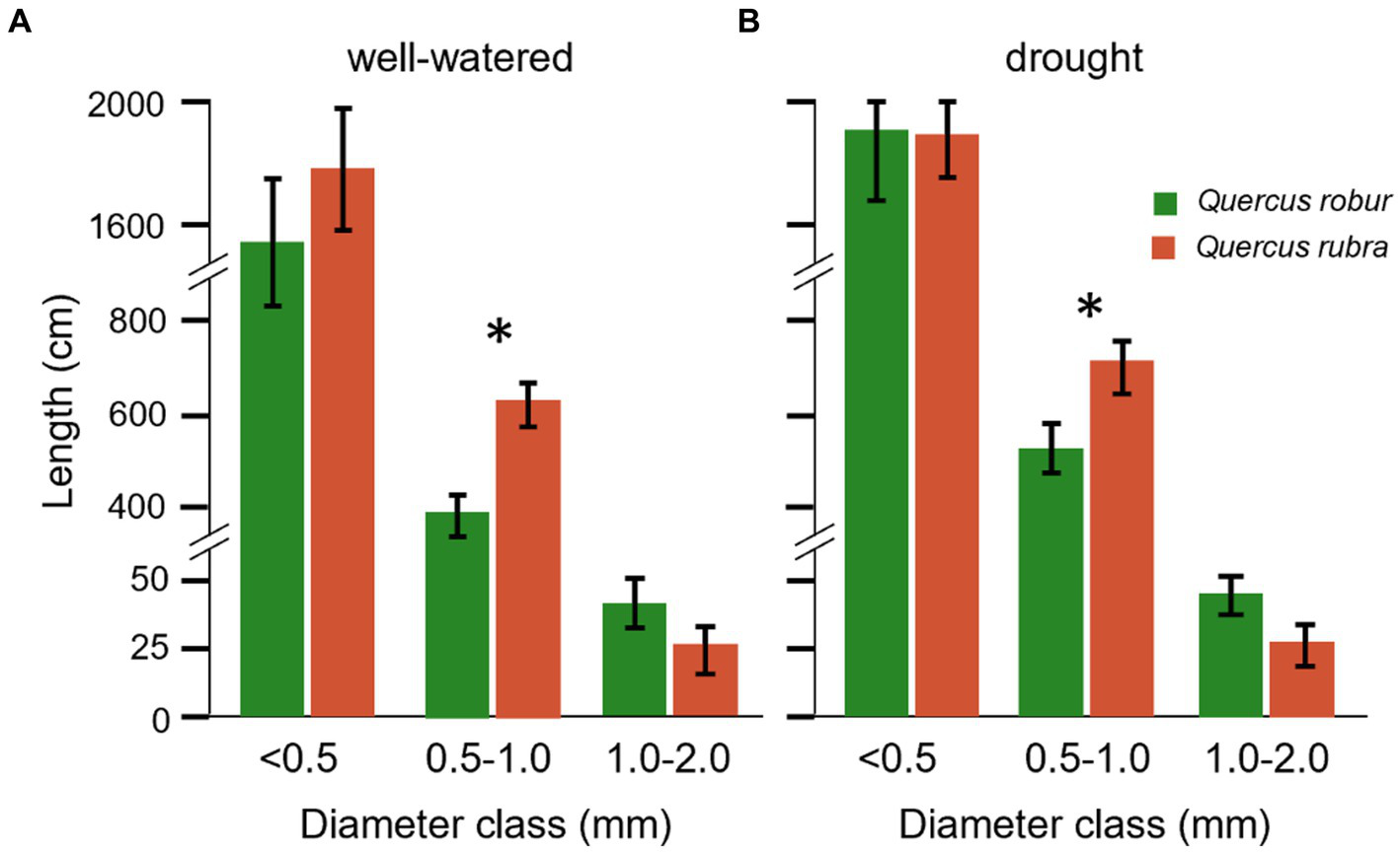 Root length for different diameter classes of Quercus robur (green) and Quercus rubra (dark red) under well-watered (A) and drought treatments (B). Values refer to and pool the 20–32 days temporal range; each bar represents the mean of 24 replicates ±1SE. An asterisk (*) indicates a significant difference between species within each diameter class (student’s t-test, p < 0.05).