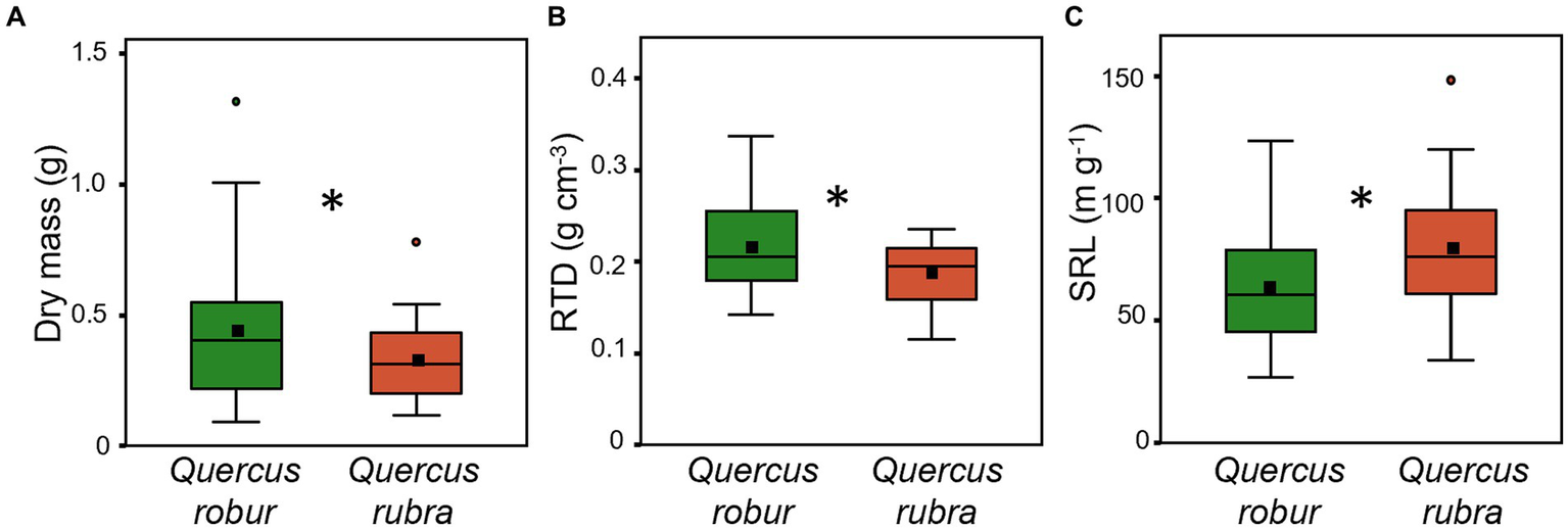 Fine root (<2 mm) dry mass (A), RTD (B) and SRL (C) for 4 months-old Quercus robur (green) and Quercus rubra (dark red) seedlings. Values refer to the 20–32 days temporal range and pooled well-watered and drought treatments (n = 24). An asterisk (*) indicates a significant difference between species (three-way ANOVA main factor, p < 0.05). Vertical boxes represent approximately 50% of the observations (25th to 75th percentiles), and lines extending from each box are the upper and lower 25% of the distribution. Within each box, the solid horizontal line indicates the median, while the squared filled dot represents the mean.