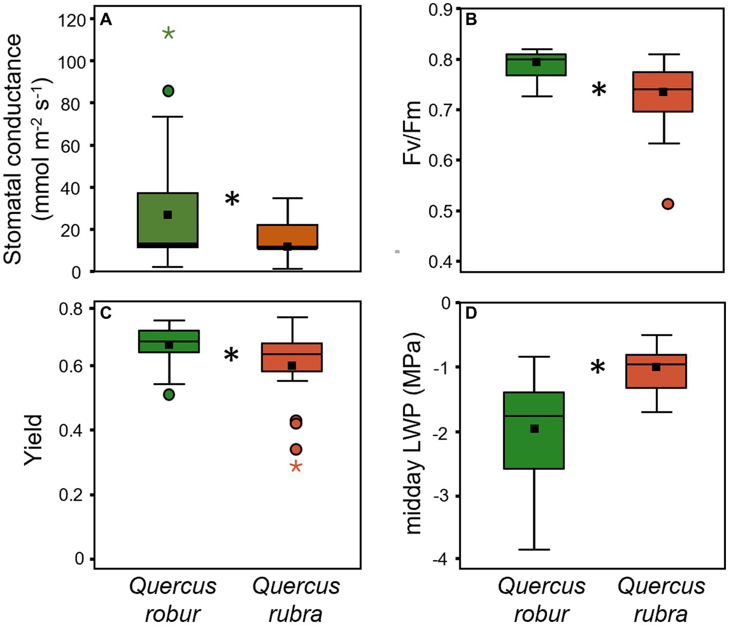 Stomatal conductance (A), Fv/Fm(B), yield (C), and midday LWP (D) for 4 months-old Quercus robur (green) and Quercus rubra (dark red) seedlings. Values refer to the 20–32 days temporal range and pooled well-watered and drought treatments (n = 24). An asterisk (*) indicates a significant difference between species (three-way ANOVA main factor for stomatal conductance, non-parametric Mann–Whitney test for Fv/Fm, yield, and midday LWP, p < 0.05). Vertical boxes represent approximately 50% of the observations, and lines extending from each box are the upper and lower 25% of the distribution. Within each box, the solid horizontal line indicates the median, while the squared filled dot represents the mean.