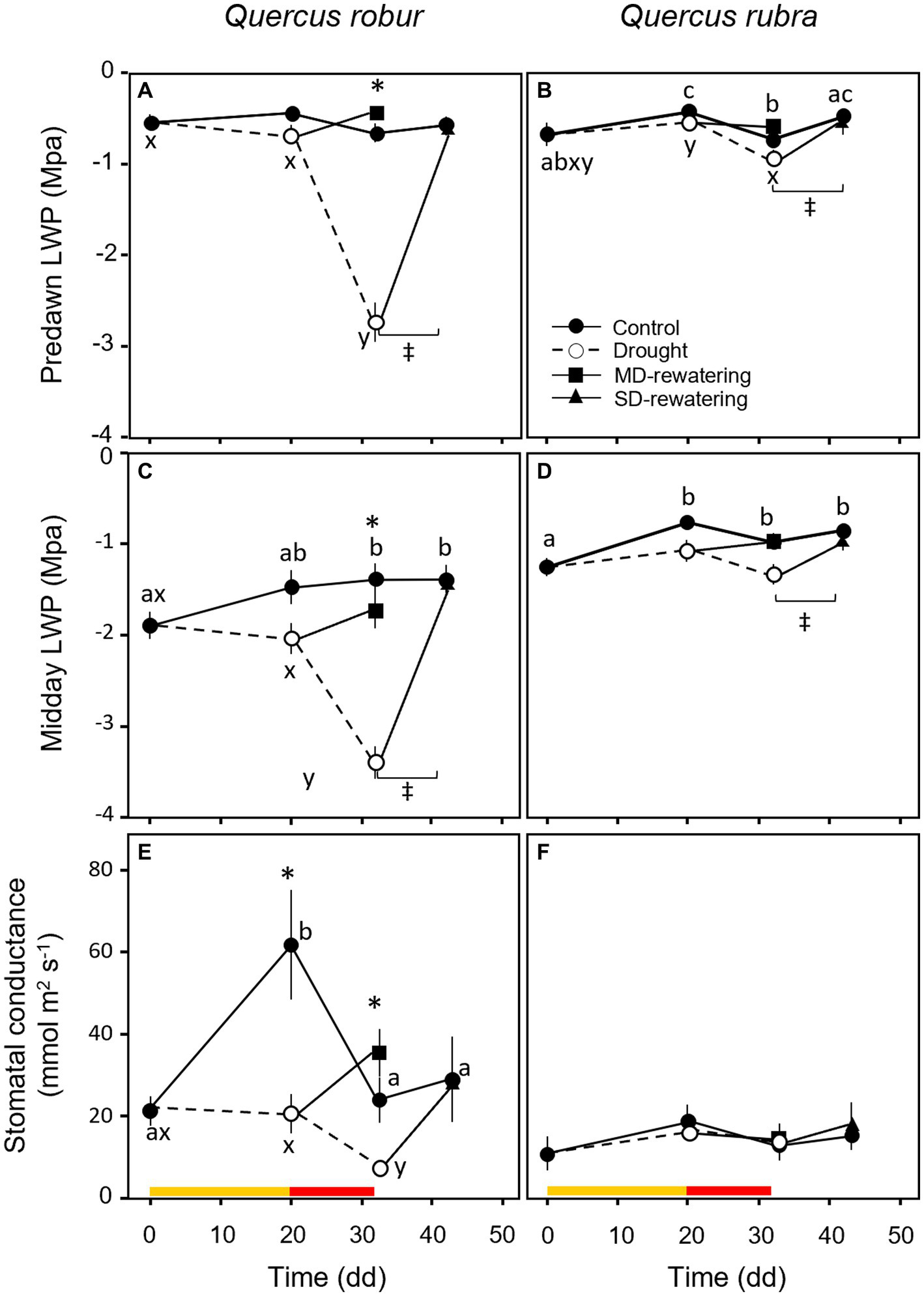 Temporal pattern of predawn (A,B) and midday (C,D) LWP and stomatal conductance (E,F) over the experimental period for 4 months-old Quercus robur (left column) and Quercus rubra (right column) seedlings under two drought intensity levels with the respective rewatering events. Continuous (–) and dashed (– – –) lines indicate watered and drought conditions, respectively; filled and white circles indicate control and droughted plants, respectively; filled square and triangle indicate the recovery from drought 12 days from MD and SD stress, respectively. Values are the means of 6 replicates ±1SE. Colored strips indicate the duration and intensity of the drought treatments: dark-yellow for moderate-drought, red for severe-drought. If written, a, b, c and x, y, z indicate significant differences between different sampling points within control and drought treatments, respectively (LSD, p < 0.05); * indicate significant differences between control and drought within each sampling point, and ‡ between droughted and rewatered plants for both MD and SD treatments (student’s t-test, p < 0.05). Differences were considered significant at p < 0.05.
