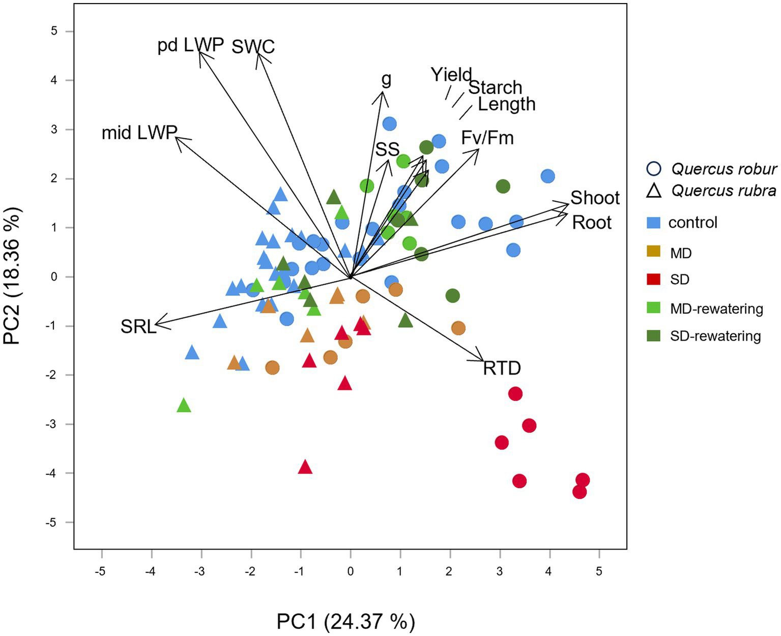 The second component explained 18.36% of the total variance. It divided most of the well-watered (controls and MD-and SD-rewatering) from the drought-treated plants, particularly for Q. robur. Moreover, PC2 highlighted the different responses to drought between the morphological structure of fine roots and the physiology of the shoot, with LWP, stomatal conductance, photochemical efficiency and starch positively correlated with SWC than RTD and SRL, which are positioned on the other side (Figure 10). Starch and SS concentrations also decreased with the increasing drought intensity (Figure 10).