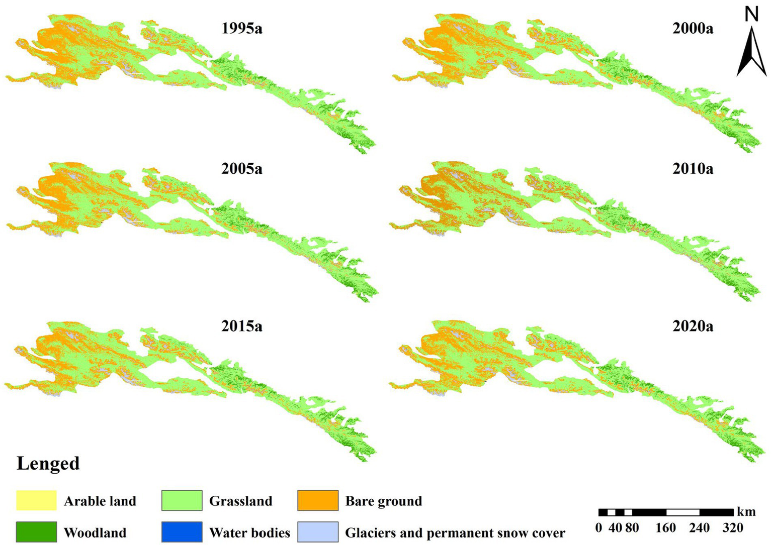 Land use types of Qilian Mountain National Park from 1995 to 2020.