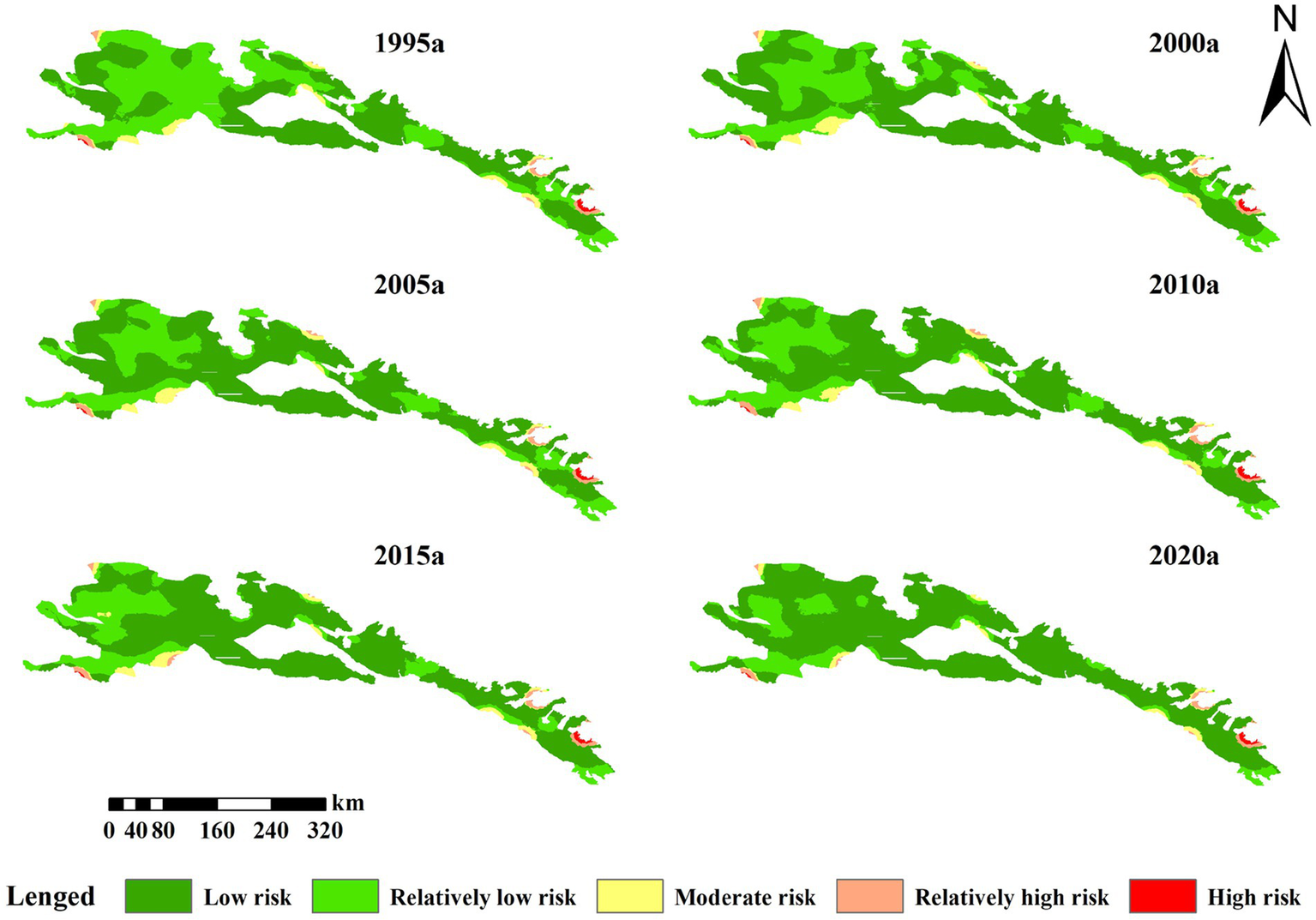 The study area was classified into low risk (ERI < 0.01), relatively low risk (ERI = 0.01–0.02), moderate risk (ERI = 0.02–0.04), relatively high risk (ERI = 0.04–0.08), and high risk (ERI > 0.08), using the natural break method and the landscape ERI (calculated from Equation 1). This classification allowed for the generation of an ecological risk level map and facilitated the assessment of changes in the area for each risk level.
