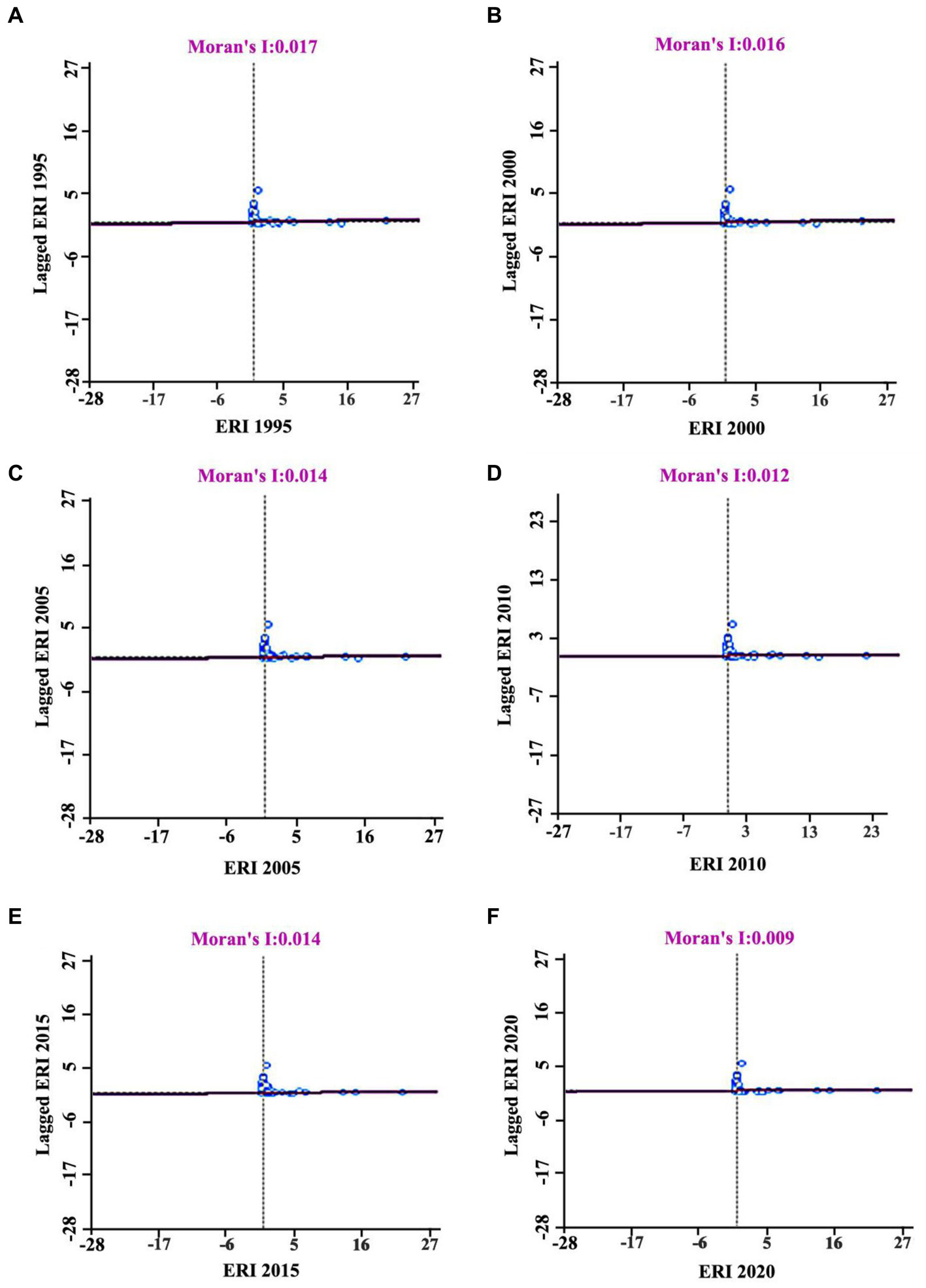 Spatial autocorrelation analysis is undertaken to examine the significant relationships between attribute values of a specific feature and those of neighboring features in space to the objective of such analysis is to uncover the spatial correlation patterns of attribute characteristics between spatial reference units and their adjacent units. It encompasses two key indicators: global spatial autocorrelation index and local spatial autocorrelation index (Bosso et al., 2017; Wang et al., 2020; Zhang et al., 2020). The former is commonly quantified using the Moran’s I, which enables the assessment of the spatial correlation of ecological risk across the entire study area. The value of Moran’s I is between −1 and 1, with a positive value indicating a positive spatial correlation. As the value of Moran’s I increases, the spatial correlation becomes more significant, providing valuable insights into the overall spatial pattern of ecological risk (Zhang et al., 2020). The latter, on the other hand, is visualized through the Local Indicators of Spatial Association (LISA) maps, thus depicting whether attribute values exhibit distinct patterns of high-high clustering and low-low clustering within the local areas.