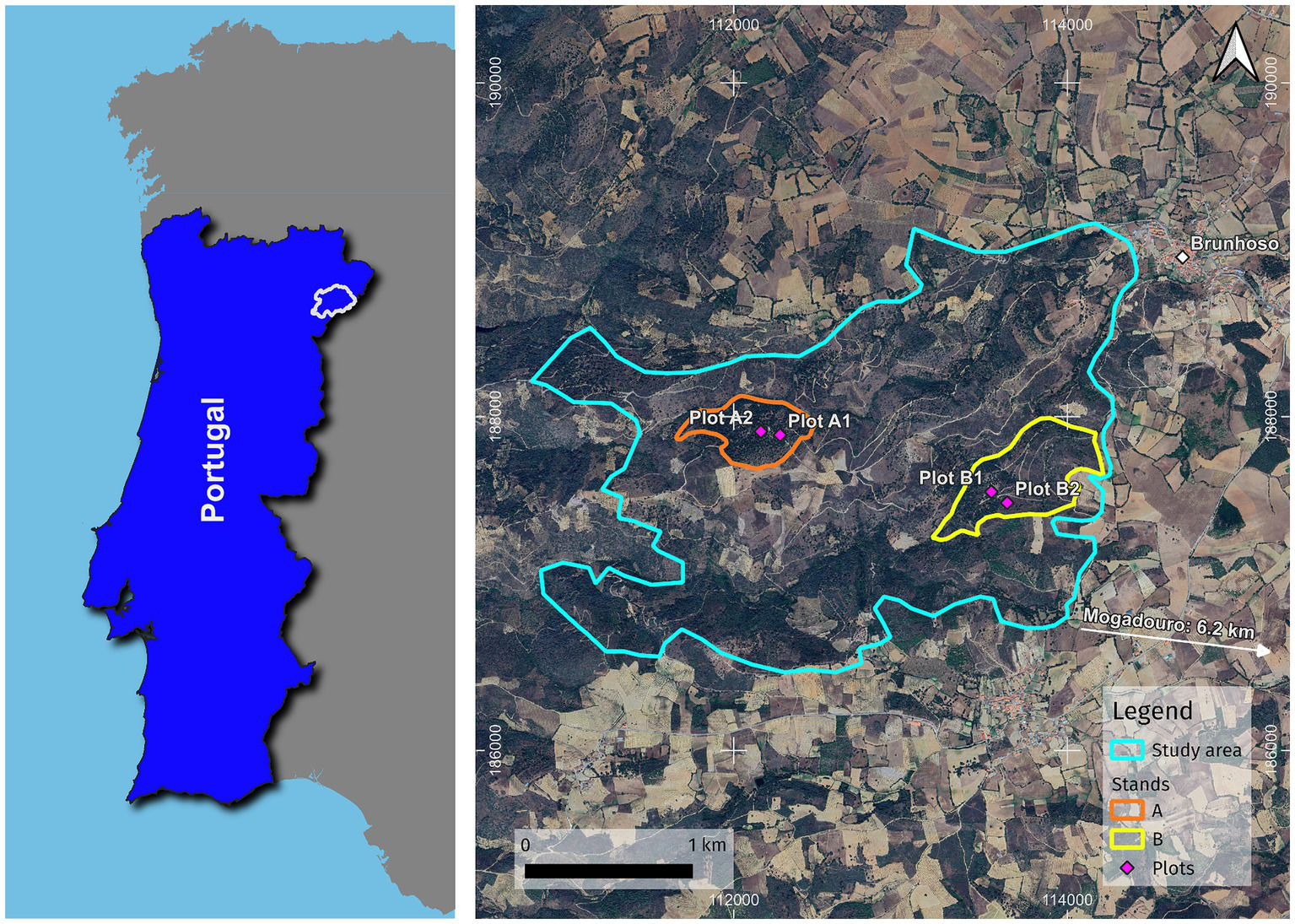 The study area is near the village of Brunhoso (ETRS89 PT TM06 geographic coordinates: 112706.54; 187665.25), in the municipality of “Mogadouro”, in Northeast Portugal (Figure 1).