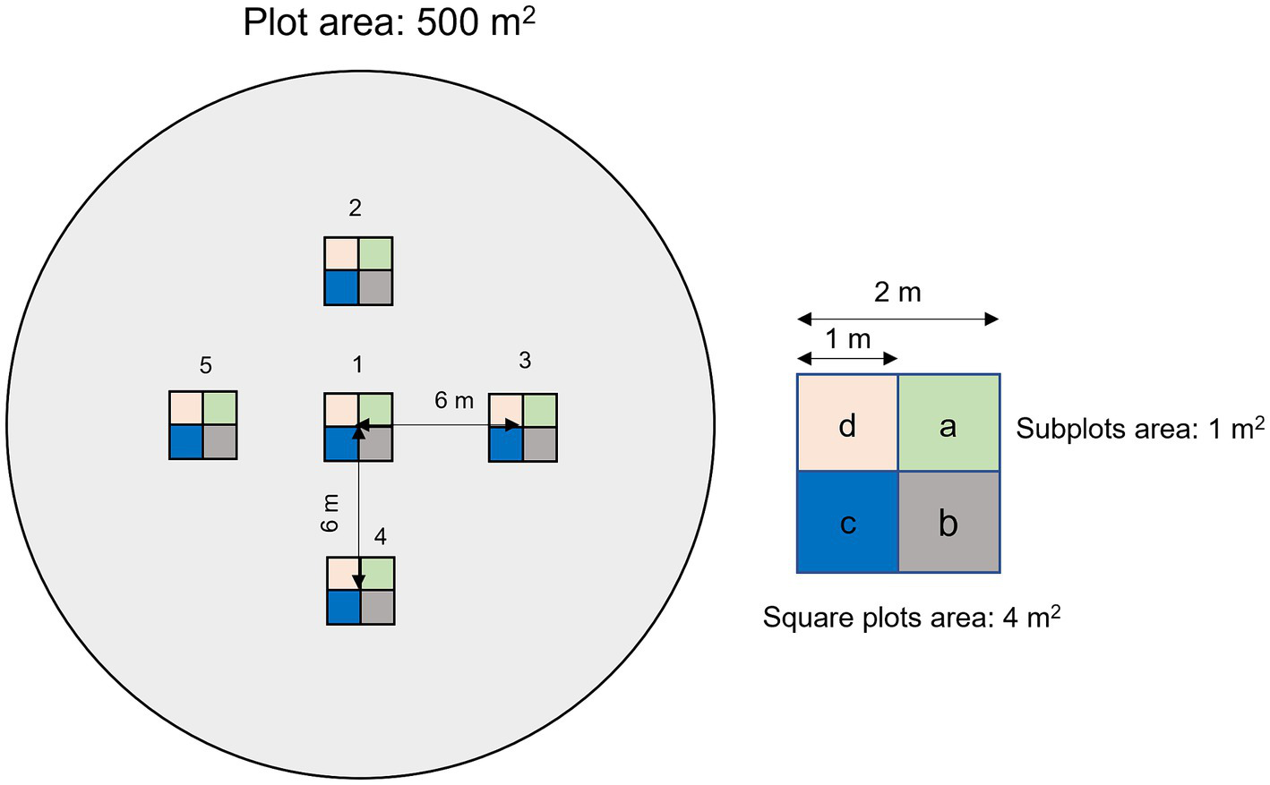 A cluster sampling (Krebs, 1999; Marques et al., 2018) design was implemented to study the natural regeneration dynamics inside each stand. In each circular plot of 500 m2 of area, five square plots of 4 m2 were installed, according to Figure 2.