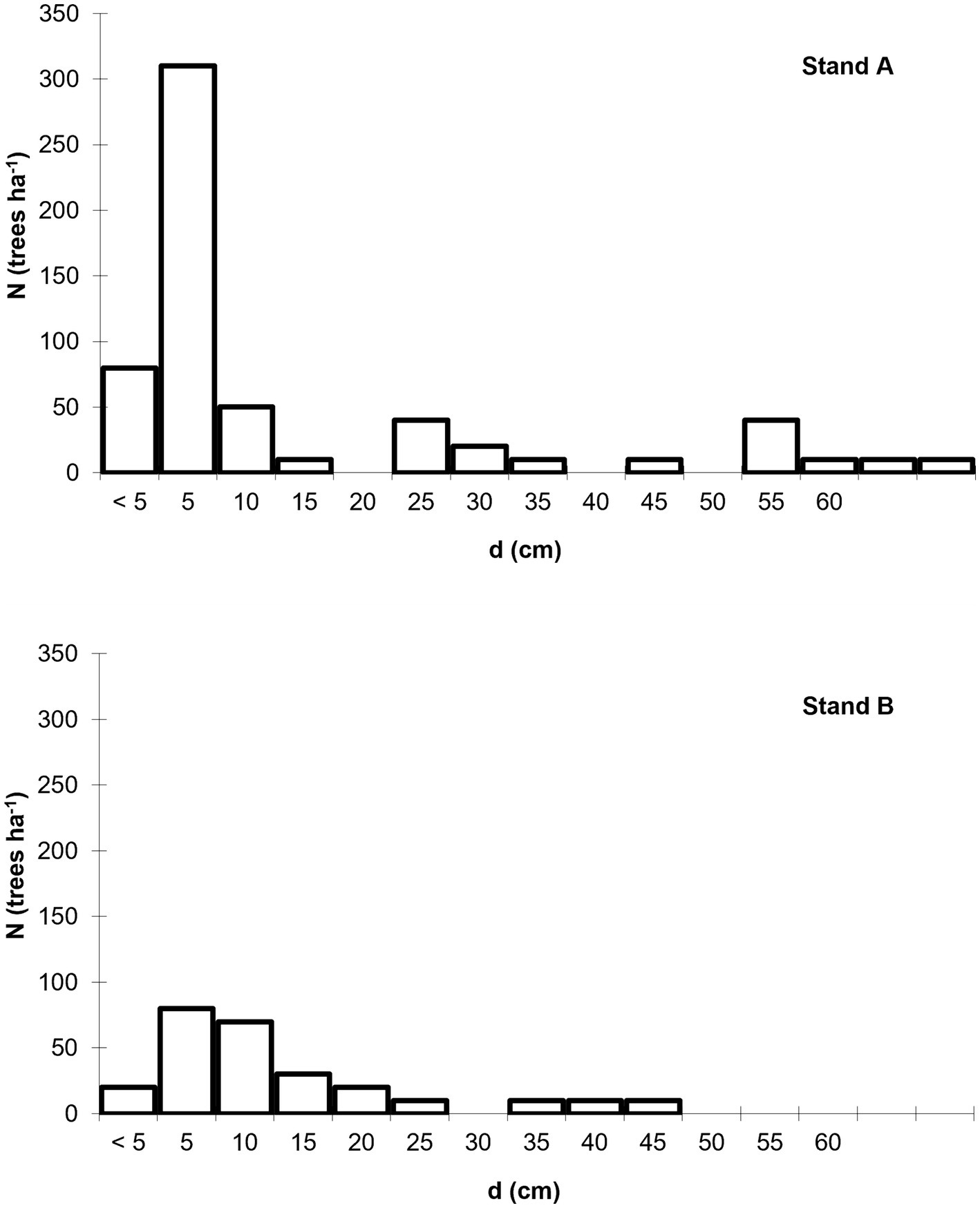 Figure 3 shows the horizontal structure of stands A and B based on the distribution of the number of trees per diameter class (range 5 cm). The d values represent the diameter classes, and on the x-axis are presented the central values of the diameter classes.