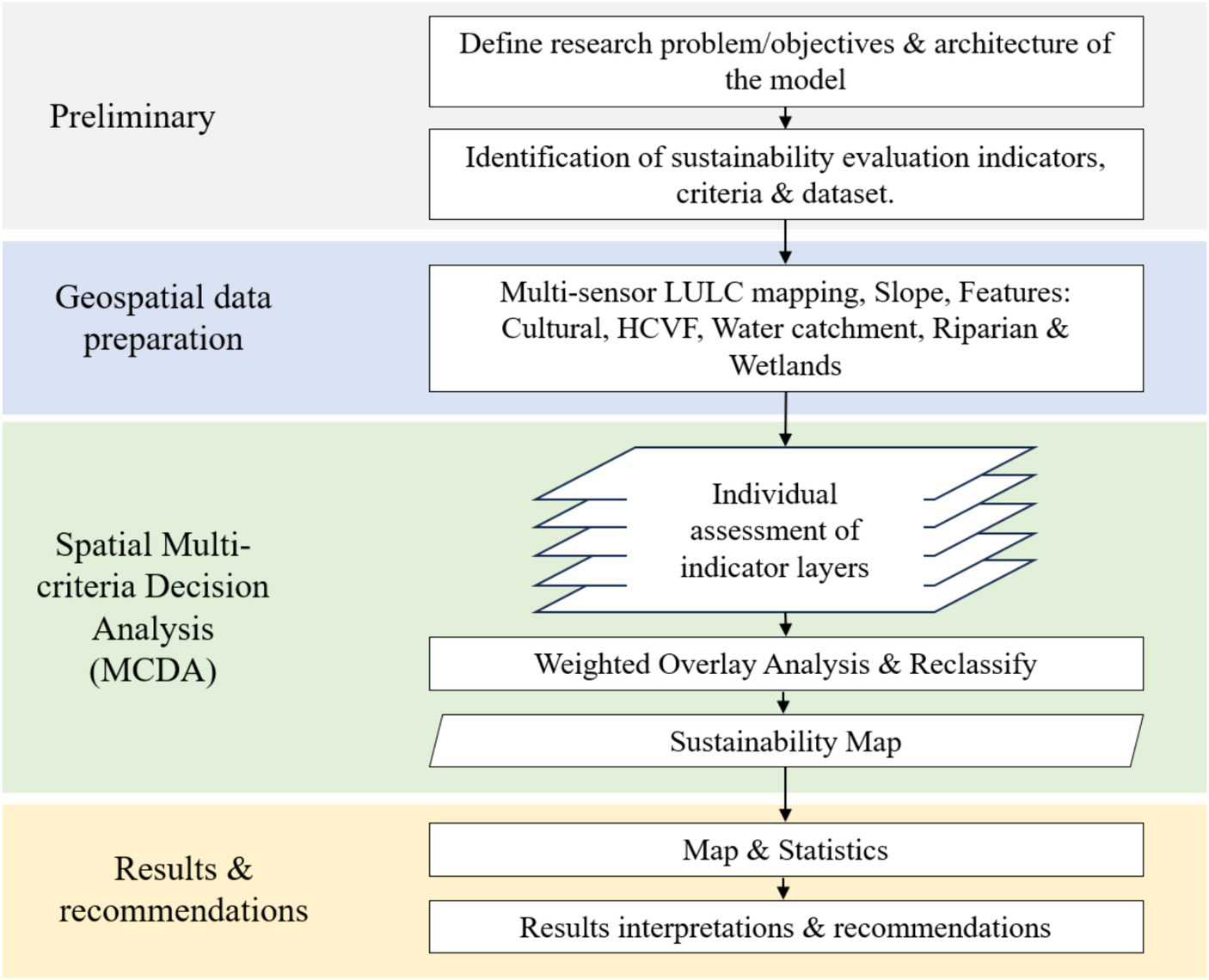 The workflow of sustainability analysis in this study is illustrated in Figure 3. It starts by defining the research problem as outlined in the introduction, followed by the objective and the architecture of the MCDA model. Continue with the identifications of sustainability evaluation indicators and criteria, in this case, sustainability category scores, as described in Tables 3, 4. Then, the second phase is the geospatial data preparation, where all the indicator layers are mapped and generated. The third phase is the analysis, where all indicator layers are analyzed using weighted overlay analysis to produce the final sustainability map. In the last phase, the map and statistics of results are produced, and finally, interpretations and recommendations are drawn. The detailed indicator layers generation workflow and analysis of the MCDA model are illustrated in Figure 3.