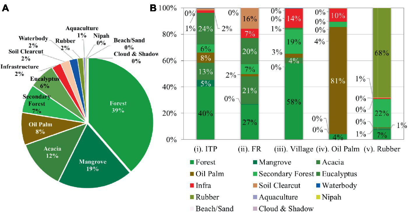 The landscapes land use and land cover (LULC) in the study area encompasses a variety of features, including mangrove forests, nipah mangroves, mixed forests with smallholder rubber plantations and crop patches, orchards, secondary growth forests, Industrial Tree Plantations (ITPs), predominantly fast-growing Acacia mangium and Eucalyptus pellita, wild Acacia, oil palm plantations, and rubber plantations and villages. The ITPs were established in the early 1980s as part of a reforestation, afforestation, and resettlement initiative led by the Sabah Government in collaboration with the Sabah Forestry Department and supported by the World Bank (JICA, 1984). Acacia mangium is a preferred species in ITP due to its fast growth and flexibility in growing on poor and degraded soil (Hon and Shibata, 1970). Acacia is harvestable after 7 years with a high survival rate of 50–60% and yield volume between 150 and 170 m3 ha-1 (Lee, 2018). In 2002, approximately 72% (106,581 hectares) of fast-growing tree species planted in Sabah were Acacia mangium (Abe et al., 2005). The forests consist of mixed patches of lowland natural tropical forest, secondary forest, mangrove, and nipah. At the same time, the major plantations in the study area are oil palm, rubber plantations, and Industrial Tree Plantation (ITP).