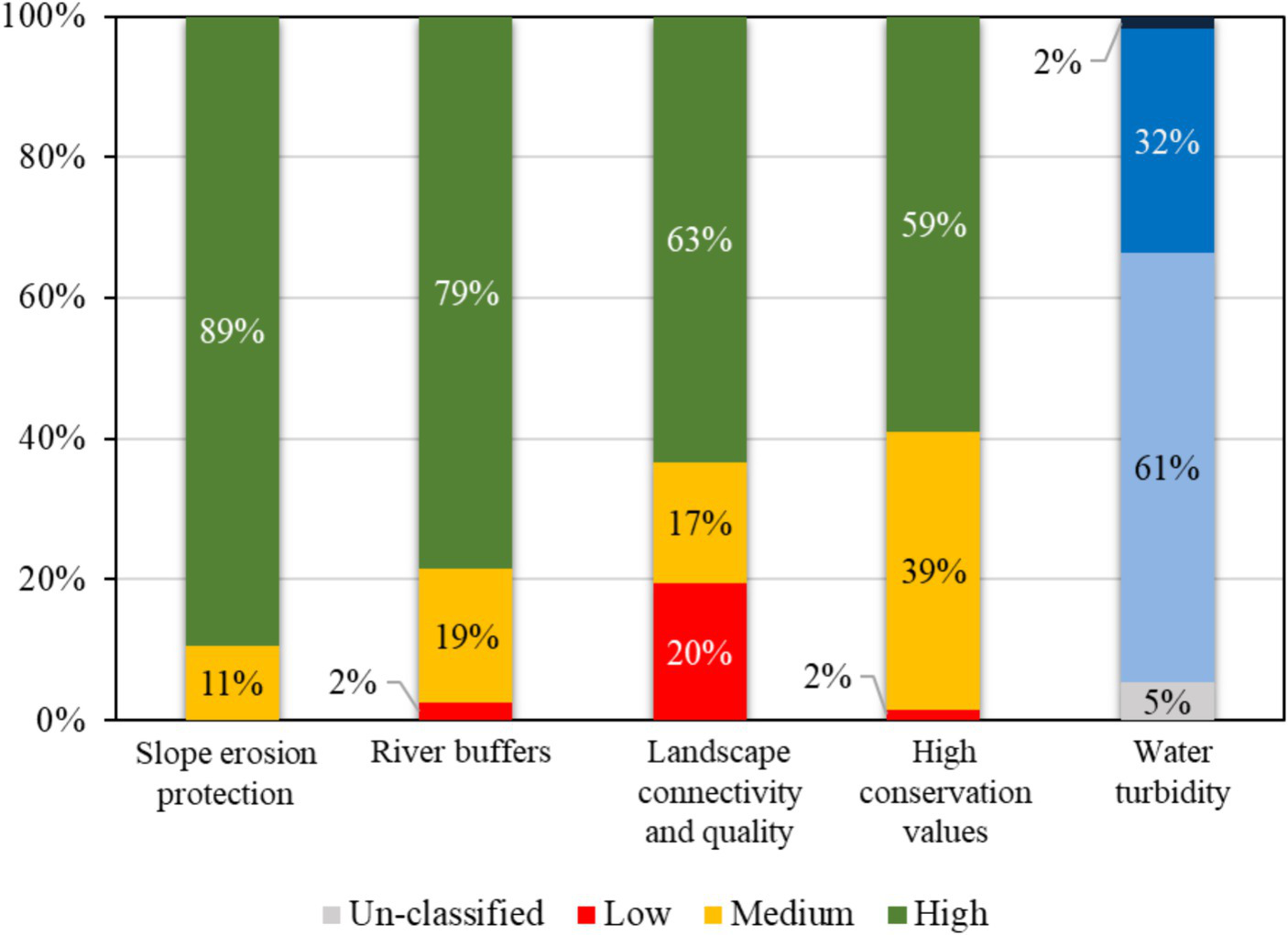 In this study, five sustainability indicators were used to assess the environmental sustainability of the study site. These indicators were selected based on their relevance to the study objectives and their ability to provide insights into sustainability. Previous studies (Hristov and Chirico, 2019; Nath et al., 2021; Wong et al., 2023) have identified a range of indicators related to biodiversity, water quality, erosions slope protection, and riparian reserves.
