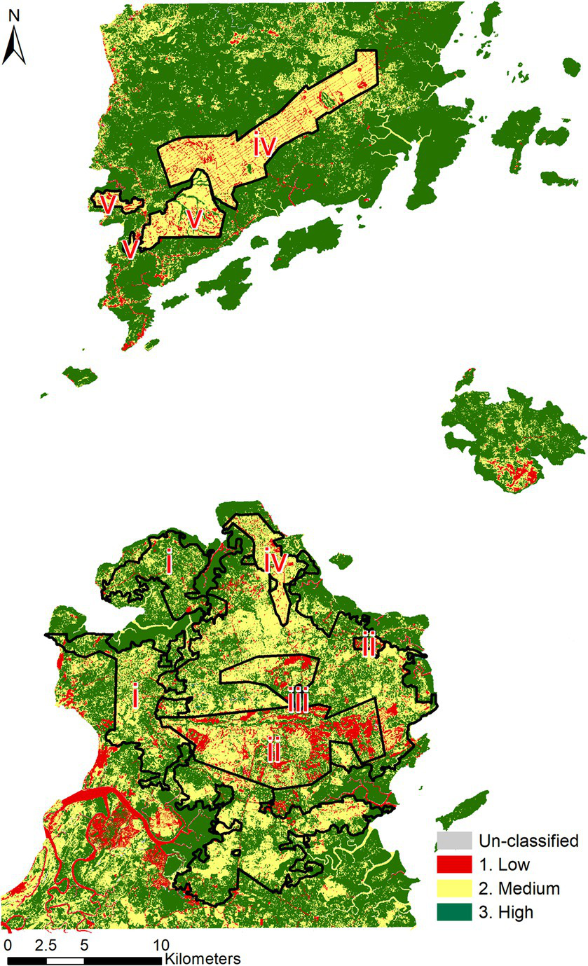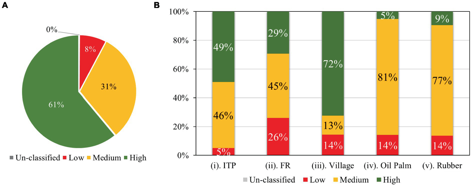 Landscape connectivity depicts the vital links between forest patches across the landscape, serving as a crucial habitat for diverse flora and fauna. Ensuring the quality and connectivity of these landscapes is paramount for maintaining viable populations of species, particularly iconic ones found in Borneo, such as the Bornean orangutans (Pongo pygmaeus), proboscis monkey (Nasalis larvatus), pygmy elephants (Elephas maximus borneensis), bearded pigs (Susbarbatus), and sun bears Helarctos malayanus (Alamgir et al., 2020). Retaining connectivity between remaining forested areas within oil palm, rubber plantations, and ITP is essential for the movement and survival of terrestrial species. In this study, the standard used for class sustainability rating is based on the RSPO Manual of Best Management Practices (BMPs), Environmental Protection Department (EPD) standards, and FMP document, which studies were conducted with external consultants and local communities, as summarized in Table 5. The conservation and forest cover criterion focuses on maintaining the integrity of forest ecosystems and protecting biodiversity. This involves measures to prevent deforestation, habitat fragmentation, and the loss of endangered species. By prioritizing landscape connectivity and biodiversity conservation, we can ensure the long-term sustainability of Borneo’s unique and irreplaceable natural heritage.