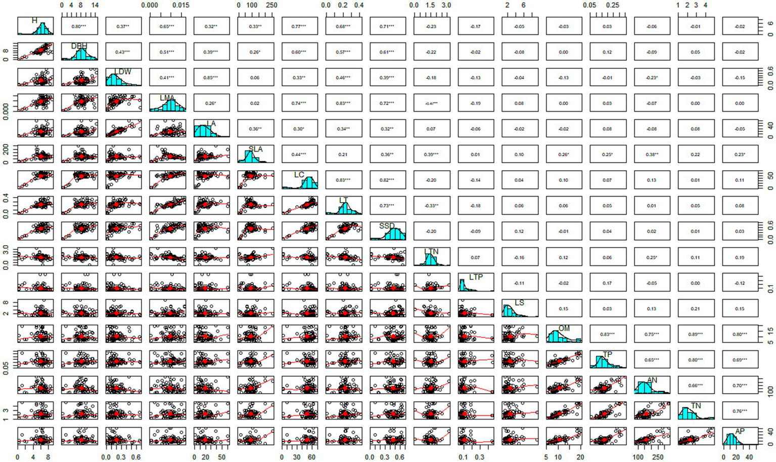 The multivariate analysis was performed to identify the correlation between the functional traits and soil nutrients (Figure 2). We found that OM was significantly positively correlated with SLA (r = 0.26, p = 0.05), but negatively associated with LTP (r = −0.02), SSD (r = −0.01), LA (r = −0.02), LDW (r = −0.13) and H (r = −0.3). The soil total phosphorus (TP) was significantly correlated with SLA (r = 0.25, p = 0.05), but negatively associated with LDW (r = −0.01). However, it was positively but weakly associated with the rest of the functional traits. The soil available nitrogen (AN) was significantly positively correlated with LTN (r = 0.25, p = 0.5), and SLA (r = 0.38, p = 0.005), while significantly negatively associated with LDW (r = −0.23, p = 0.5). Similarly, the soil available (AP) was significantly correlated with SLA (r = 0.23, p = 0.5) but negatively with LTP (r = −0.12), LA (r = −0.05), LDW (r = −0.15), dbh (r = −0.02), and H (r = −0.02). Moreover, we found that the soil total nitrogen (TN) was not significantly related to any of the functional traits indicating that plant functional traits were affected by soil TN. The results of the multiple correlation tests such as standard error, correlation value and probability value for each functional trait and soil nutrient were provided in (Supplementary Tables S5–S7).