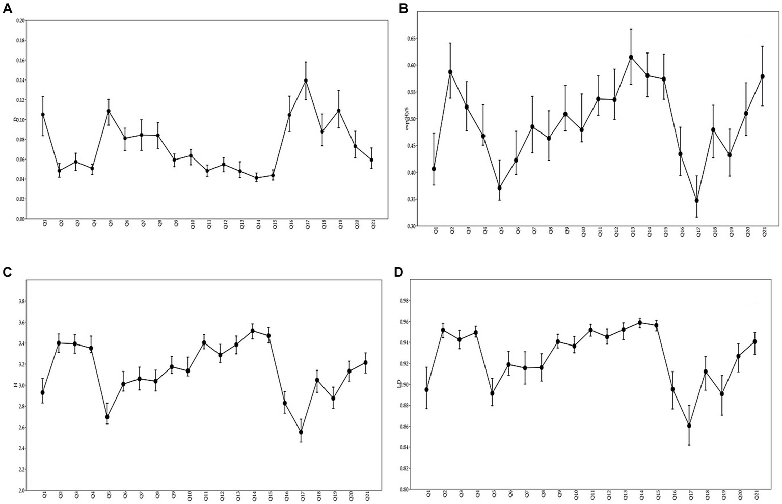 Showing Simpson’s dominance (A), Evenness (B), Shannon diversity index (C), and Simpson diversity (D).