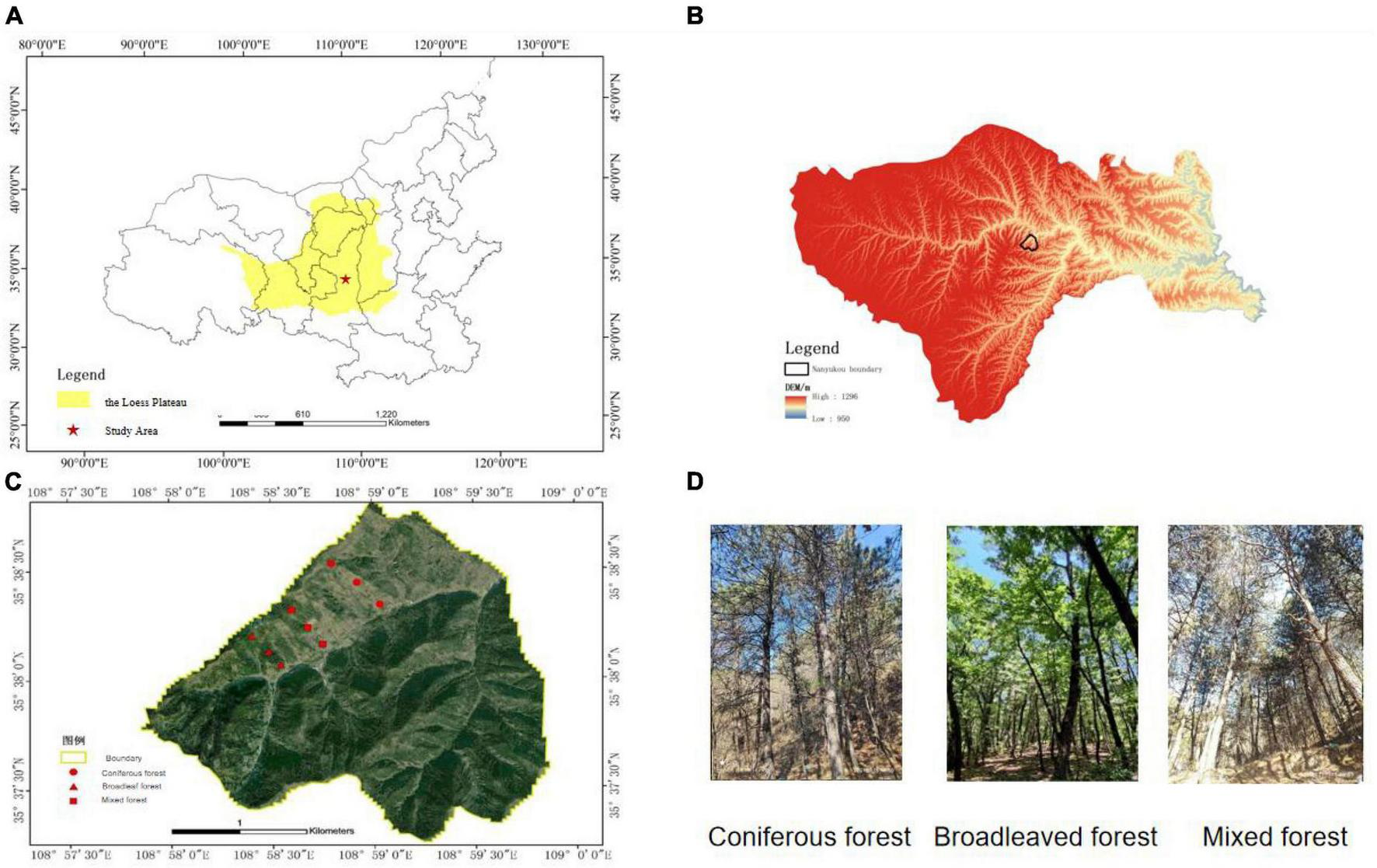 Location of study area and plots. (A) The location of the study area in the Loess Plateau. (B) DEM of study area mountain ranges. (C) Plots location. (D) Photos of plots.