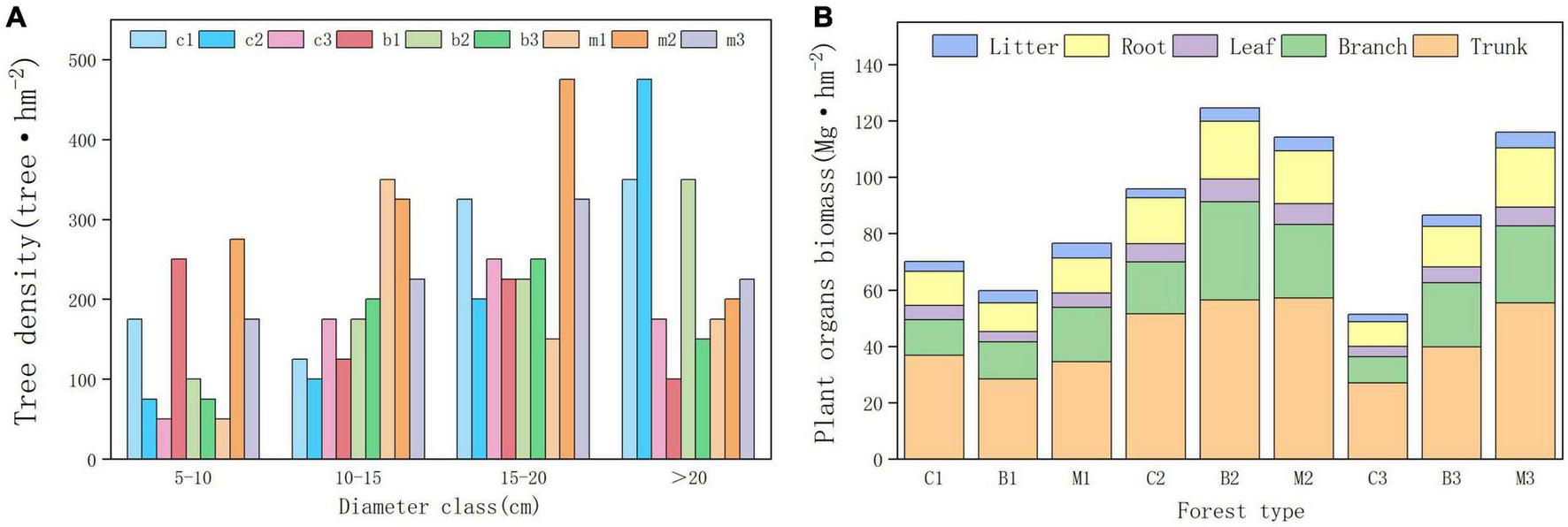 Forest development indicators. (A) Tree density in different diameter class. (B) Tree organs biomass in different plots.