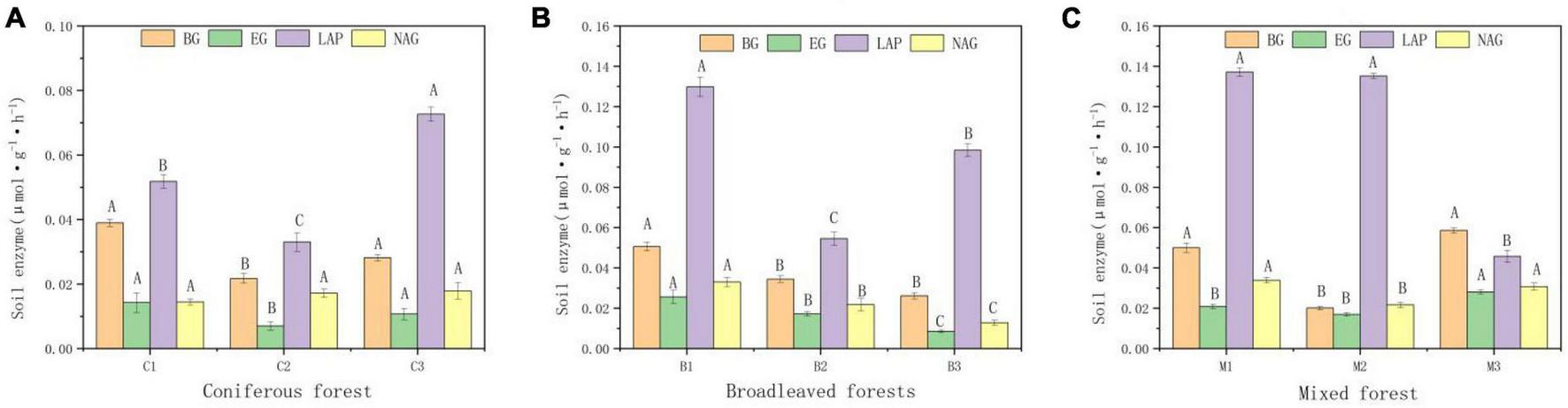 Activities of b-glucosidase (BG), Glycoside hydrolases, (EC), leucine aminopeptidase (LAP), N-acetyl-β-glucosidase (NAG) of soil. (A) Soil enzymes in Coniferous forest. (B) Soil enzymes in Broadleaved forest. (C) Soil enzymes in Mixed forest. Different capital letters indicate that the soil enzyme is significantly different at different elevations (p < 0.05).