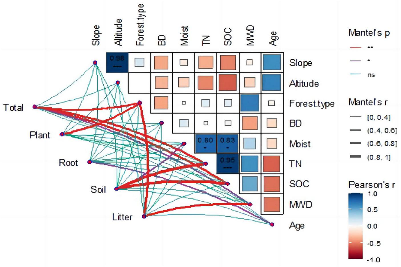 | Forest type | Altitude (m) | BD (g ⋅ cm−3) | TN (g ⋅ kg−1) | SOC (g ⋅ kg−1) | MWD | Moist (%) |