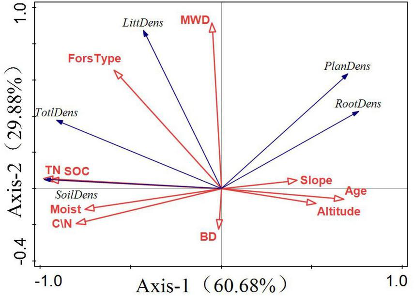 In addition to plant factors, soil differences are also the reasons for the differences in carbon sequestration rates of different forest types. According to previous studies, soil carbon storage content varies greatly among different stand types, which is related to stand site type, climatic conditions, and forest property, etc. Previous studies have found that SOC storage of the 0–60 cm layer of the six soils was Picea asperata Mast > Quercus aliena var acuteserrata (Matoutan forest farm) > Pine-oak mixed forest > for Pinus armandii Franch > Quercus aliena var acuteserrata (Xinjiashan forest farm) > Pinus tabulaeformis Carr. There was a significant positive correlation between soil organic carbon content and soil total nitrogen content (Wang et al., 2015). Under the same climatic conditions, Wang et al.’s (2012) research in Jiufeng area of Beijing showed that broad-leaved forest was more able to accumulate soil organic carbon than coniferous forest (Wang et al., 2012).