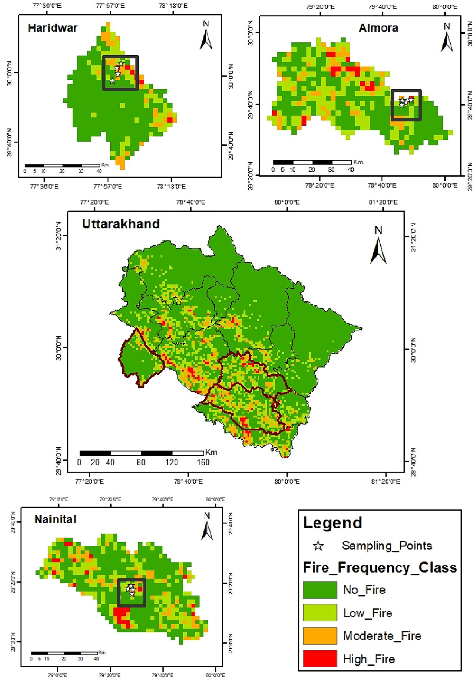Forest fire frequency maps were created for the state of Uttarakhand by using Landsat 5, 7, and 8 satellite imagery spanning a decade (2011–2020). The MODIS hotspot data (MOD14) from NASA’s Fire Information for Resource Management System (FIRMS) official website were downloaded and integrated with shape-file data representing fire points (Bargali et al., 2023). The satellite images for specific sites were extracted, geo-corrected, and classified into four frequency classes—namely, low fire, moderate fire, and high fire frequency classes (Figure 1). Supervised classification was applied to categorize the extracted and geo-corrected satellite images of chosen study sites, including Sal Forest, Chir-Pine Forest, and Mixed Forest. Using the data management tool in ArcMap software, a fishnet was generated, and fire points and raster data were spatially joined to produce the fire frequency map. A total of 16,206 fire points were recorded and classified into four fire frequency classes for the entire state. To exclude fire points in settlements, the settlement layer was overlaid onto the fire point layer, ensuring that only fire points within forest regions were considered for analysis. The fire frequency was further divided into four classes—low fire, moderate fire, and high fire frequency classes, as illustrated in Figure 1. To maintain objectivity, a 1 hectare area for each forest type was selected within each fire frequency class.
